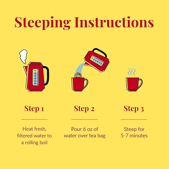 - STEEPING INSTRUCTIONS: Simply heat fresh, filtered water to a rolling boil. Then pour 6 oz water over tea and steep for 5-7 minutes.