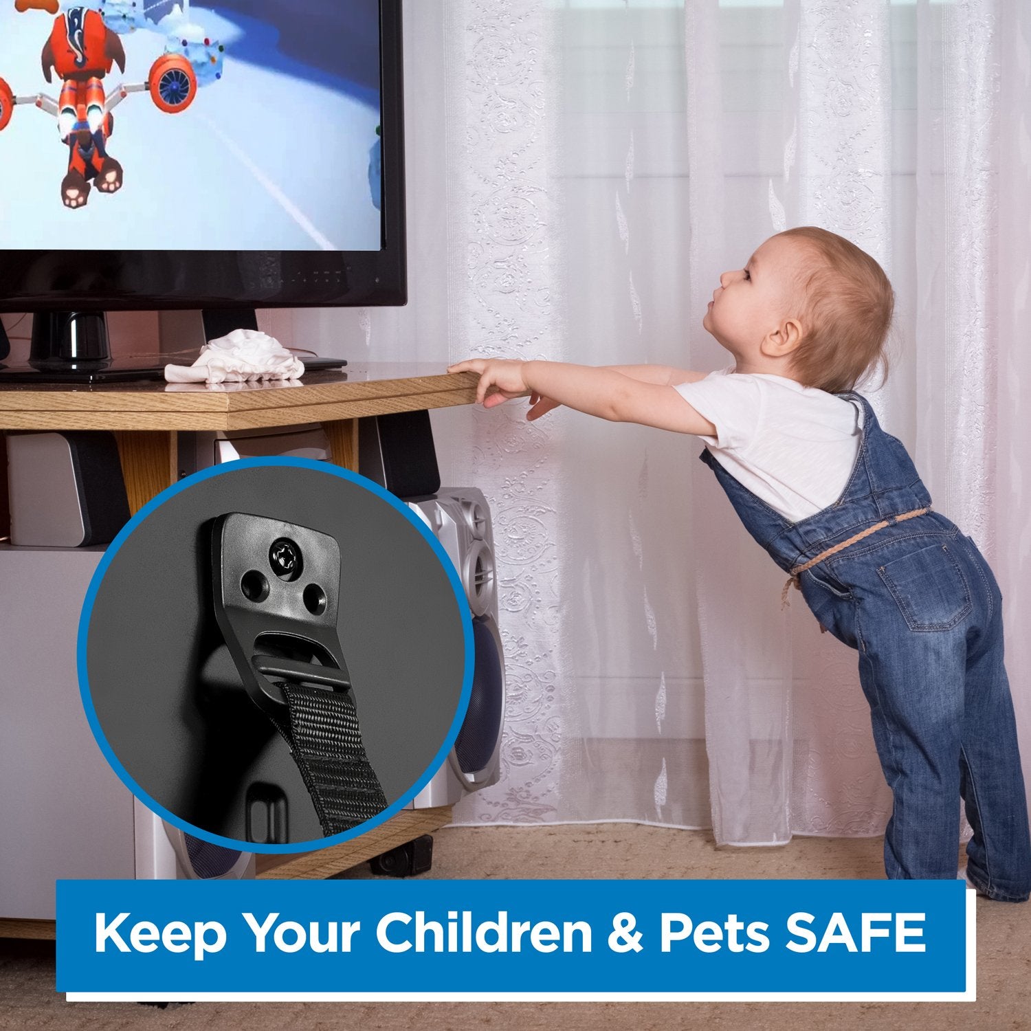 - BABY PROOF YOUR HOME AND PROTECT YOUR TV / FURNITURE: You will keep your little ones safe with our anti tip furniture kit, and will also protect your valuable TV and furniture against accidents and earthquakes. Prevent tipping accidents and save a fortune from replacing a new TV when pets knock them over.