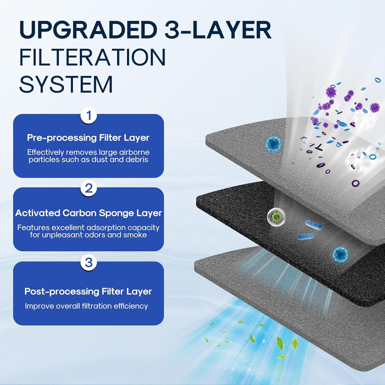- Premium Materials - High-quality carbon in three layers. A-Non-woven Cloth: remove big impurities. B-Activated Carbon Fiber: good absorption ability, Odor and smoke, etc. C-Activated Carbon Sponge: high dirty holding ability.