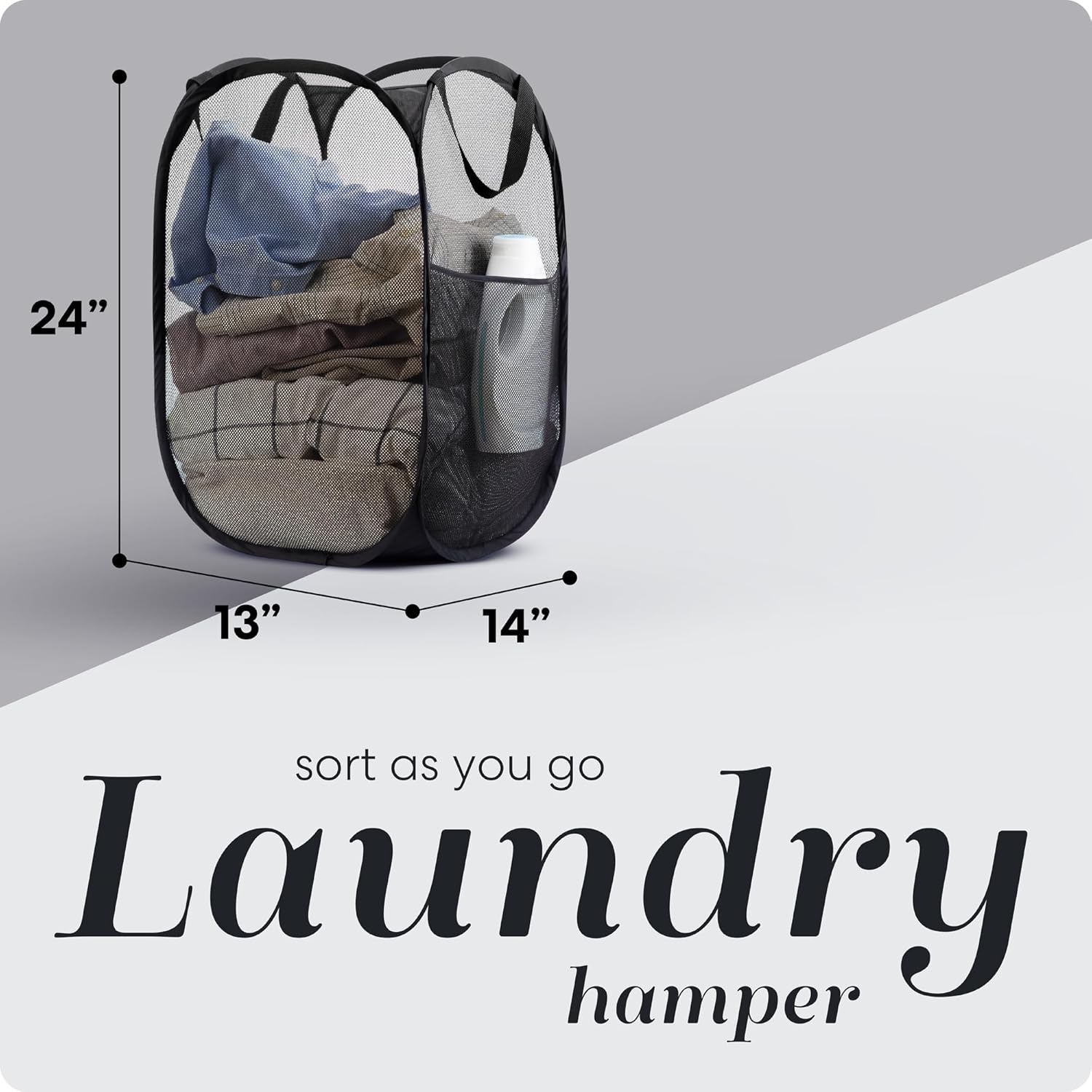 Handy Laundry Collapsible Mesh Pop Up Hamper with Wide Opening and Side Pocket - Breathable, Sturdy, Foldable, and Space-Saving Design for Clothes and Storage (Black | 2-Pack)