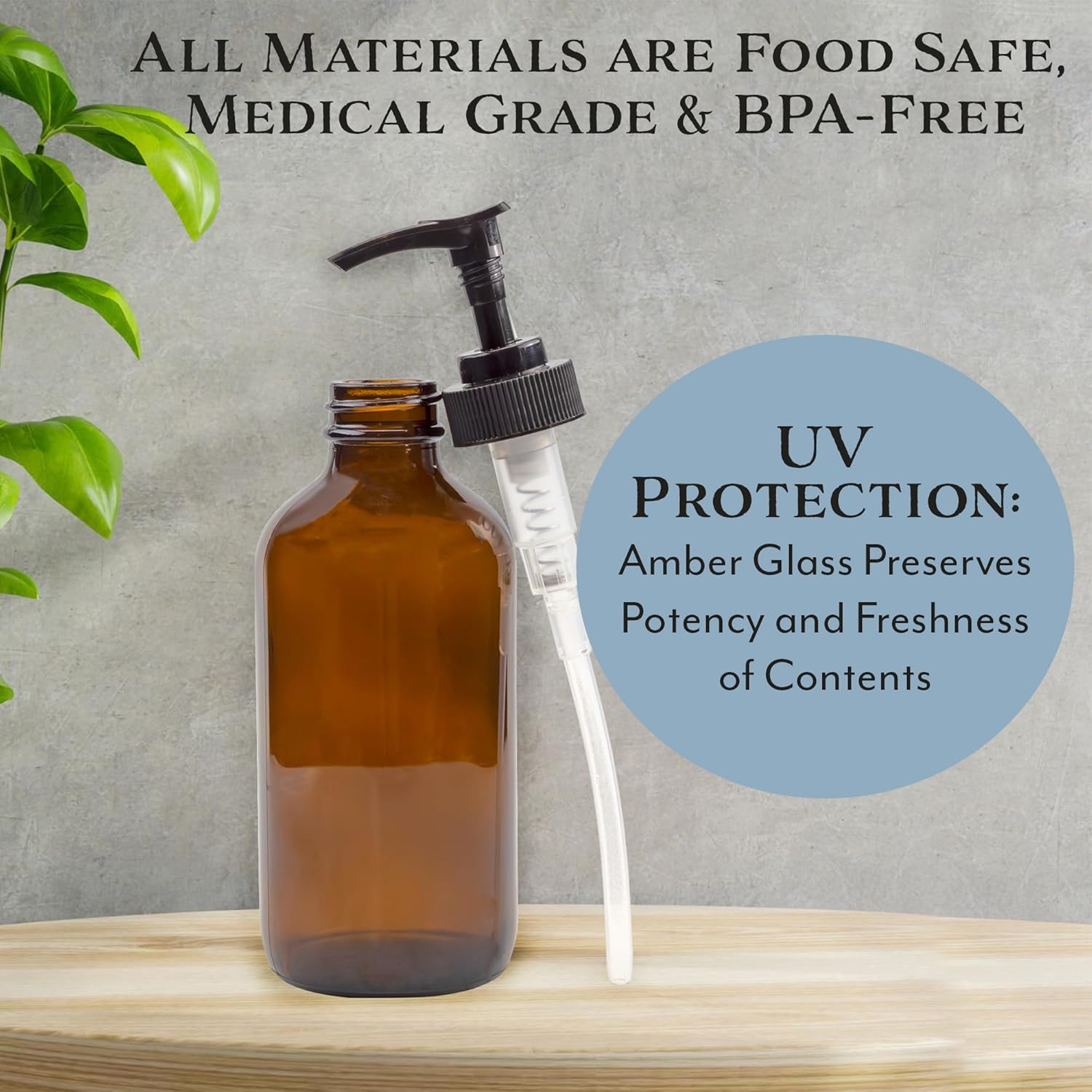 - AMBER GLASS: Amber glass provides UV protection for your contents, lead-free, food safe glass; LOCKABLE PUMPS: Twist to lock / close for storage & transport, pump tops in black plastic