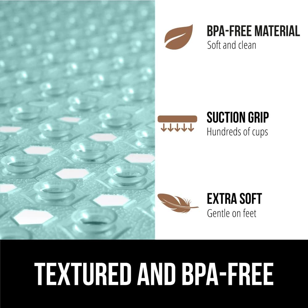 - TEXTURED AND BPA-FREE: the mat is constructed from BPA free materials; it features a unique hexagon design with a pebble textured topside that is soft on feet; shower mat is soft, flexible, and perfect for the whole family