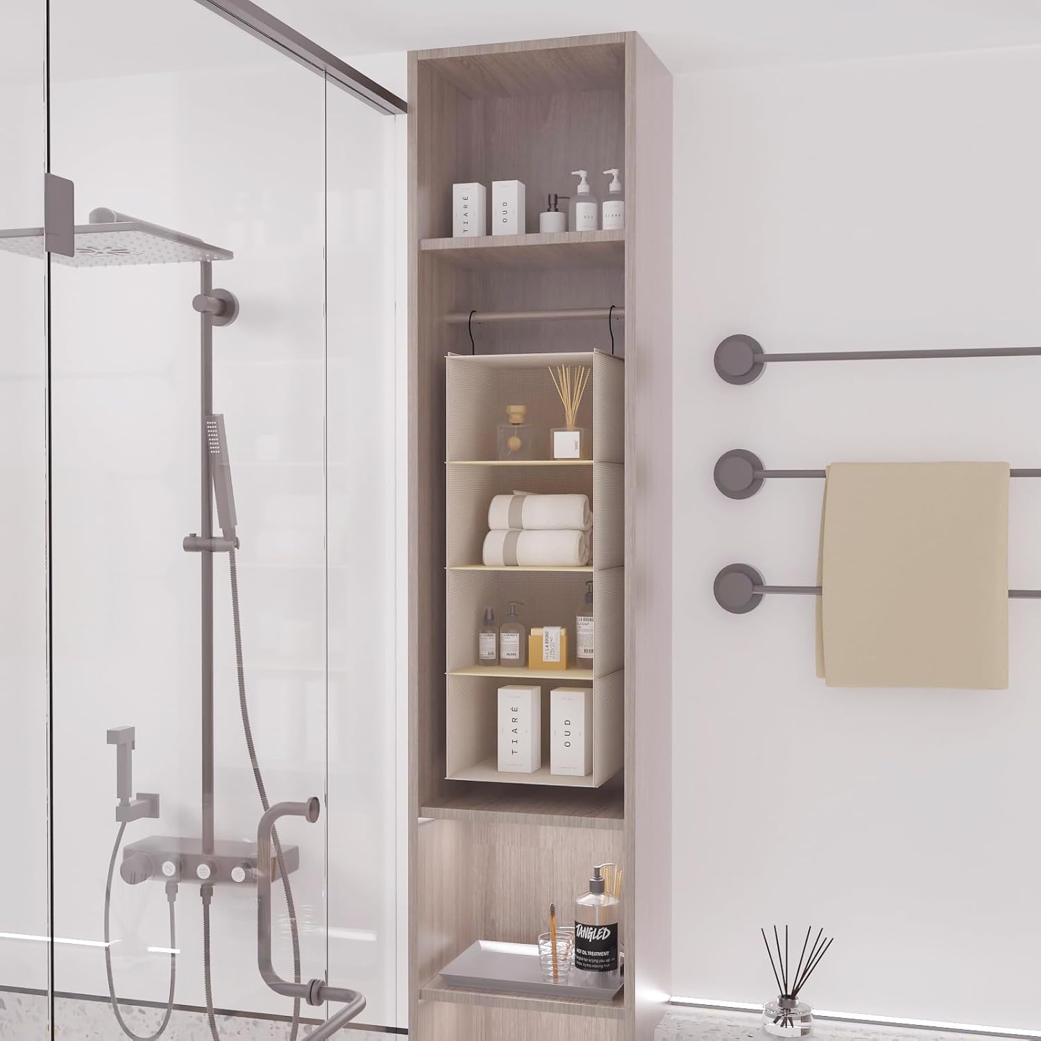 Hanging Closet Organizer and Storage, Foldable 4-Shelf Wardrobe Clothes Shelves Organizer, Imitation Linen Fabric, Beige Houndstooth
