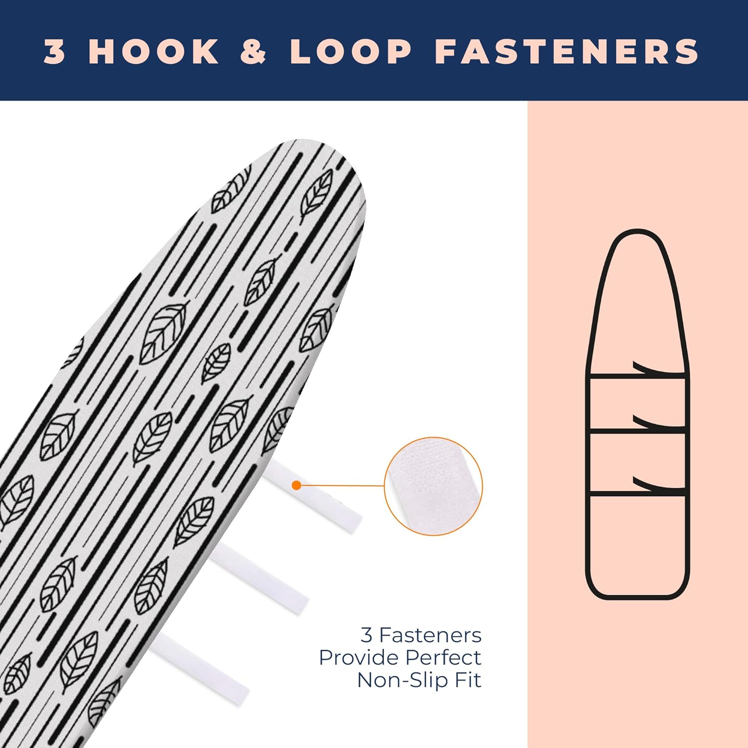 - 3 HOOK AND LOOPS, NOSE POCKET AND ELASTIC EDGES PROVIDE PERFECT NON-SLIP FIT - Elasticized edges, nose pocket and 3 hook and loops design fits the board perfectly. Slipping and the exposure of the edges will be prevented by this. Providing you to have wrinkle free clothes in a shorter time. This ironing board cover is designed for standard size boards (15x54 inches).