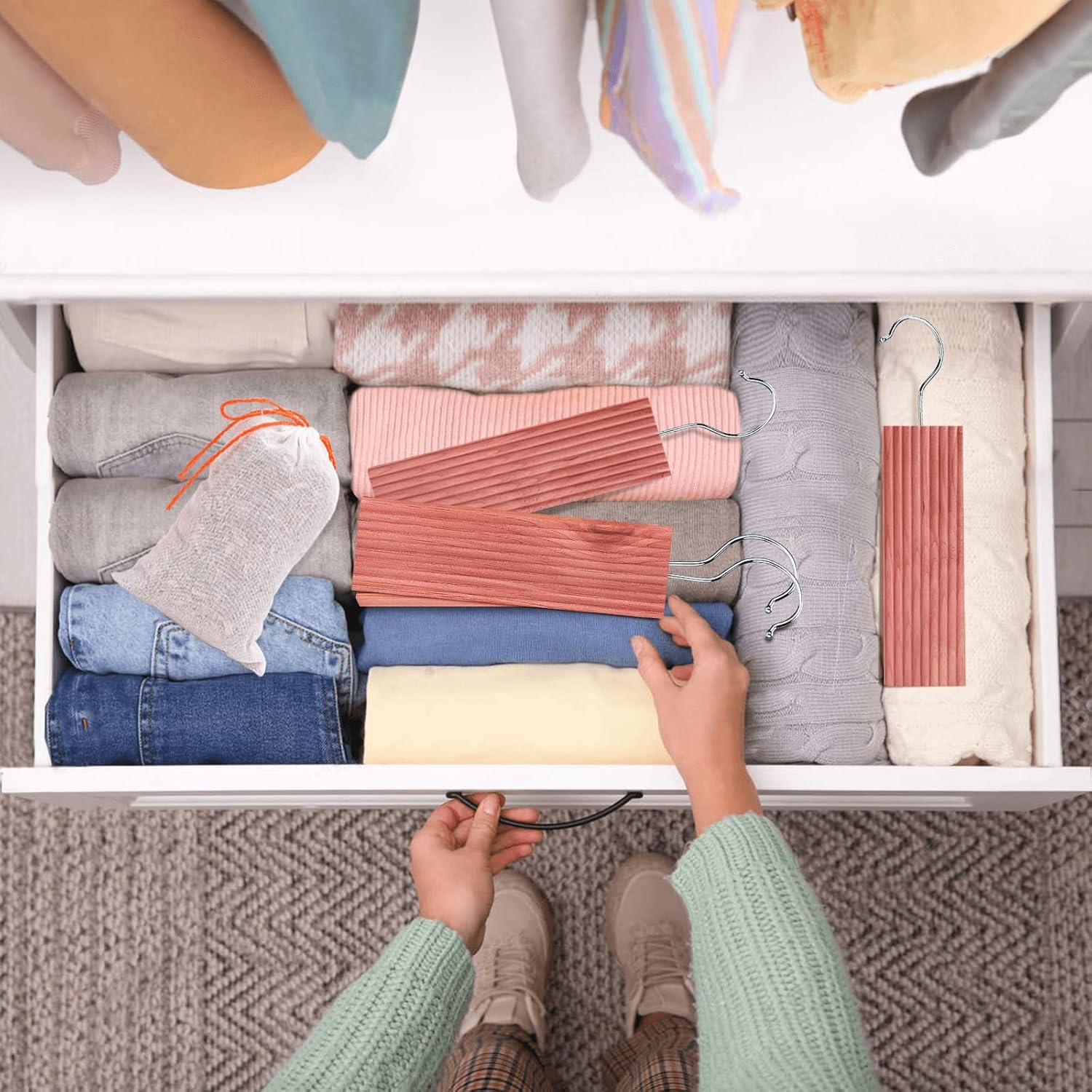 - VERSATILITY - Hanger hook assembled, allows you to hang it on closet rod easily, or place cedar hang-ups and sachets in drawers, storage bins, garment bags, that protects your clothes sweaters; And no staining in clothes