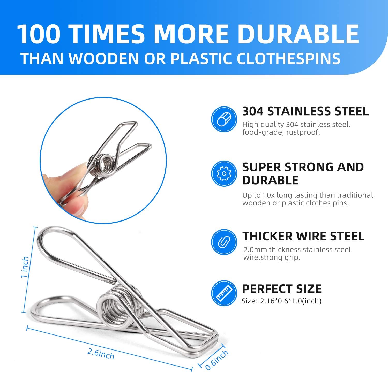 - [❤️Clothes Pins Heavy Duty Outdoor]: Our 28pack stainless steel clothespins are about 2.6inchs long and 2.0mm thick, much more durable, and have more grip power than wooden clothes pins, the clothes pins wooden may get rusted, break or get dirty, but ours always keep new, keep great grip power.