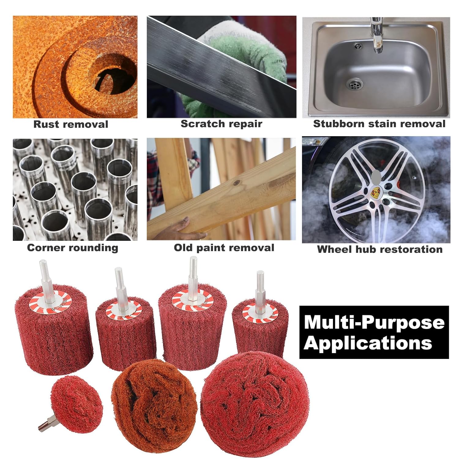 - [Elastic Abrasive Buffing Wheels Set]: These 7-pcs non-woven abrasive drill attachments is designed with an assortment of shapes and sizes, and with high flexibility, self-sharpening, high grinding efficiency, good heat dissipation.