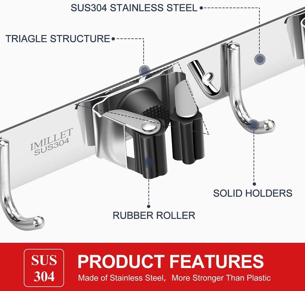 - STRONG & STURDY: Broom organizer wall mount is made of 304 stainless steel, corrosion-resistant, moisture proof and waterproof. Compared with the plastic broom rack, it's more stronger and sturdy. And this broom hanger wall mount can hold up to 200 pounds
