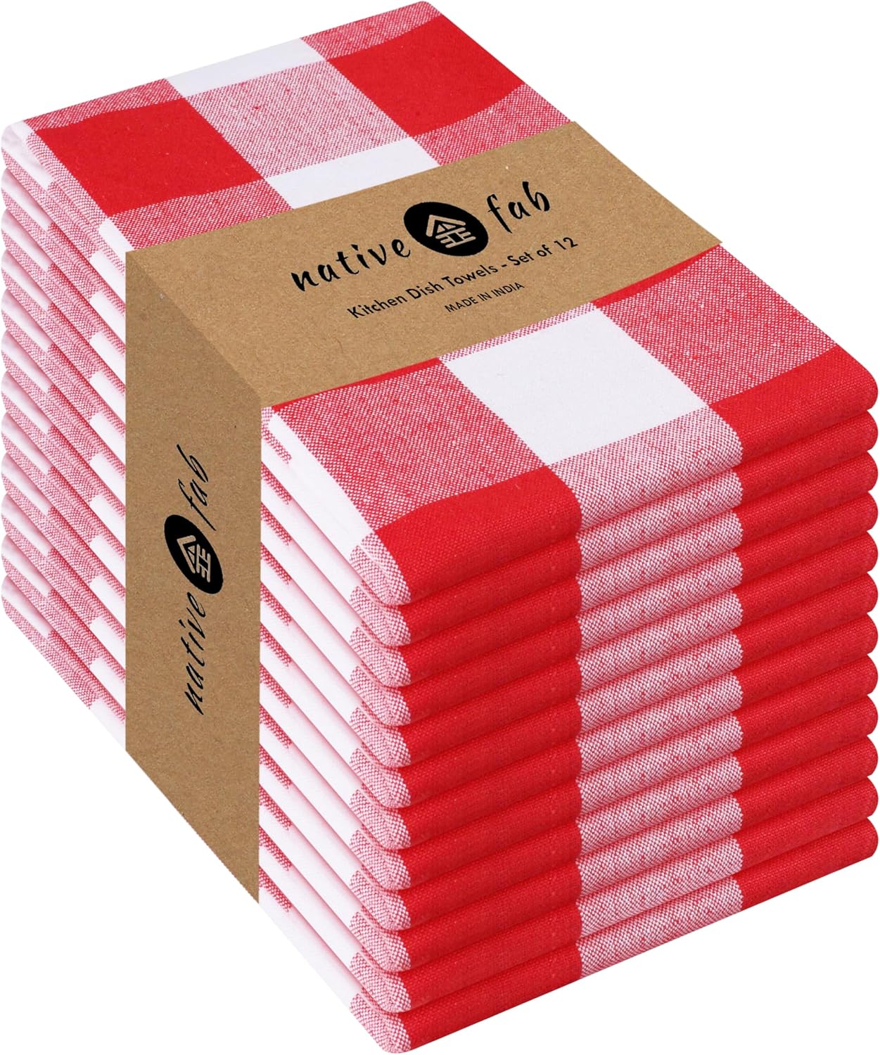 Native Fab 12-Pack Kitchen Towel with Hanging Loop 16x26 inches, Cotton Buffalo Check Kitchen Towels for Cleaning Drying, Washcloths Soft & Absorbent Cloth Rags, Bar Towel, Dish Cloth, Red