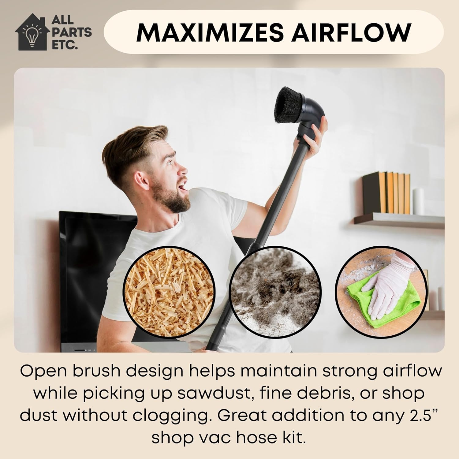 - MAXIMIZES AIRFLOW – Open brush design helps maintain strong airflow while picking up sawdust, fine debris, or shop dust without clogging. Great addition to any 2.5” shop vac hose kit.