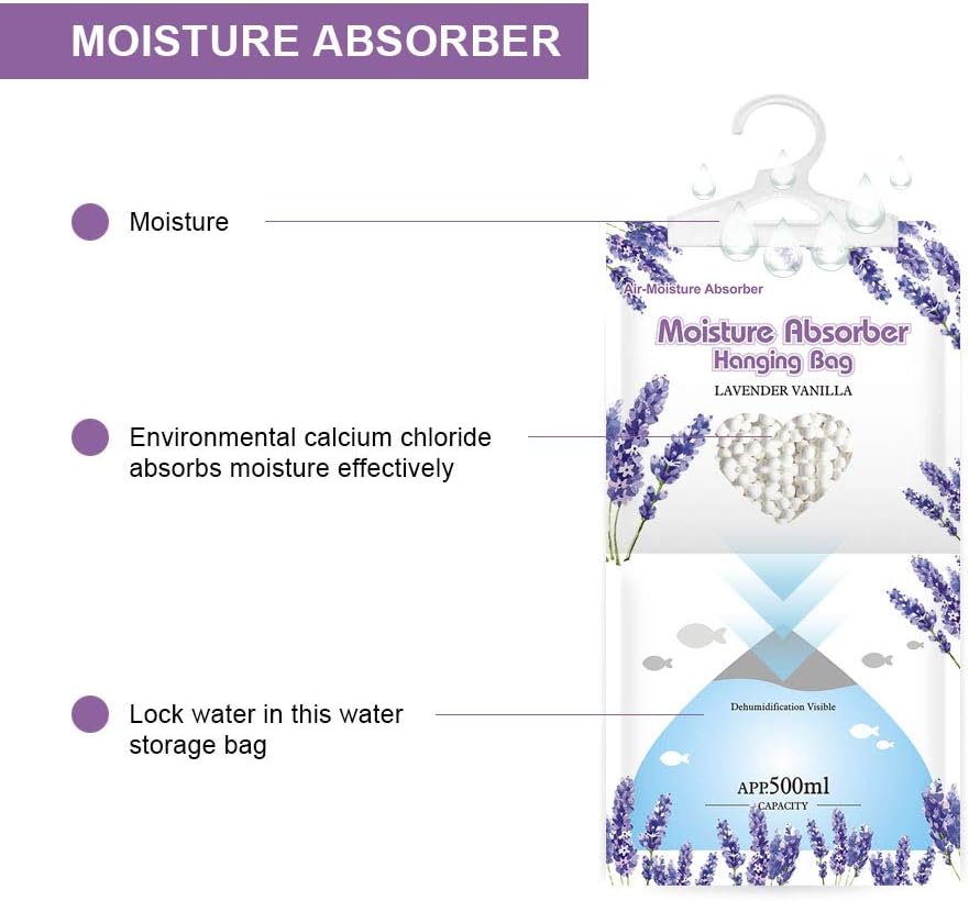 - Hanging Bag Moisture Absorber absorbs and traps excess from the air ,helps us get rid of damp.Lavender Vanilla scents.