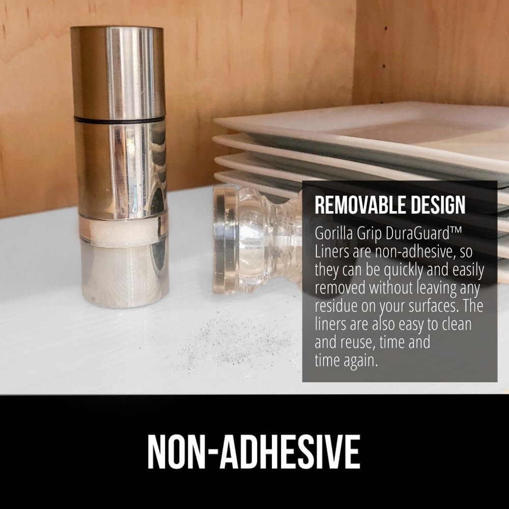 - STRONG GRIP: the Gorilla Grip DuraGuard shelf liner is a durable non adhesive liner designed to stay firmly in place on shelves, drawers and cabinets; will also help keep your items in place; they help to prevent dishware and other fragile items from shifting; designed to help reduce slipping and bunching in your drawers and cabinets