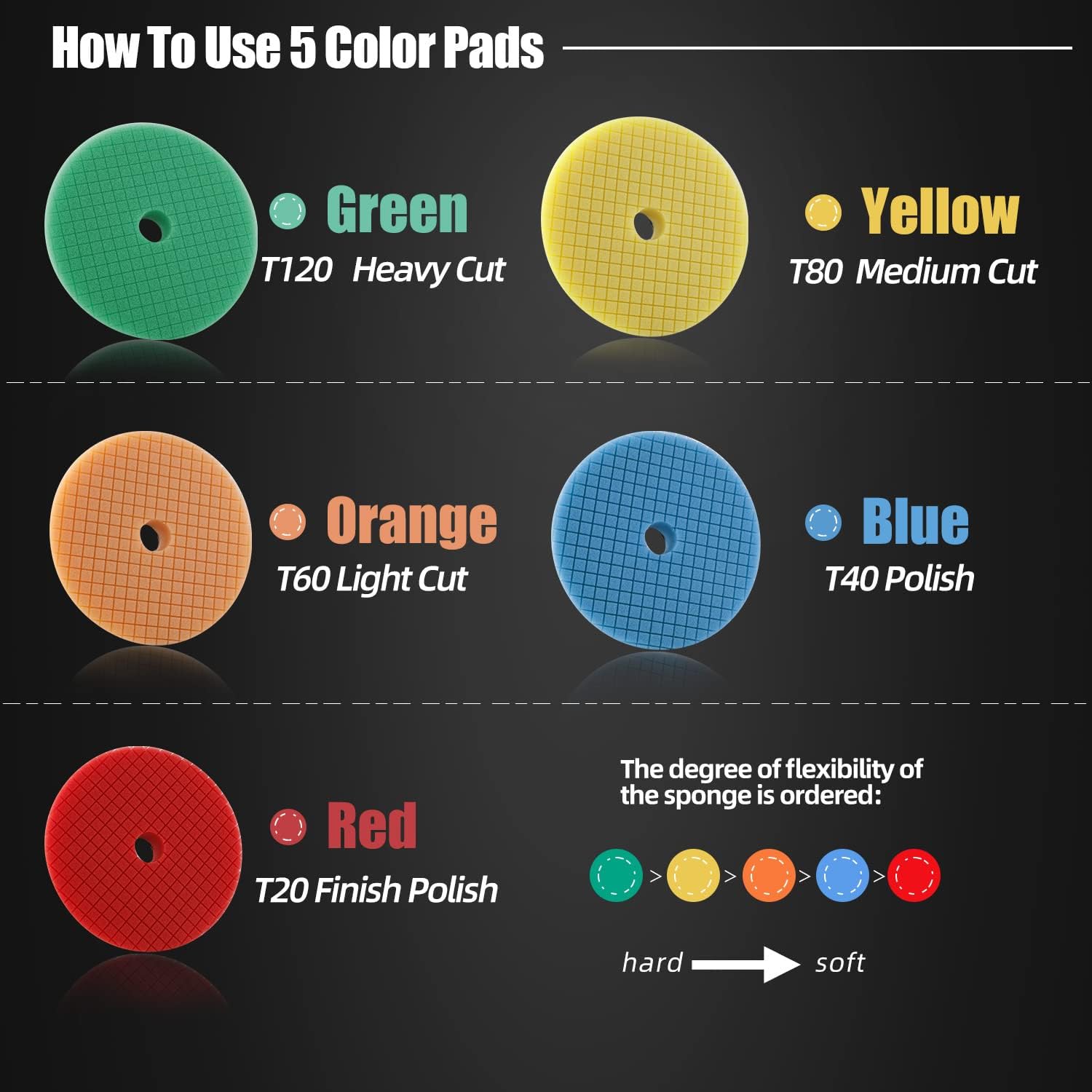 - Compounding & Polishing & Waxing in 1 set◆ Bring your car back to shiny! Great for removing sun abuse, car scratches, headlight wearing and etc. Green and Yellow compounding pad suitable for removing oxidation coating and moderate to light scratches. Orange and Blue polishing pad for removing sun abuse and swirl mask. Red pad for finishing and waxing