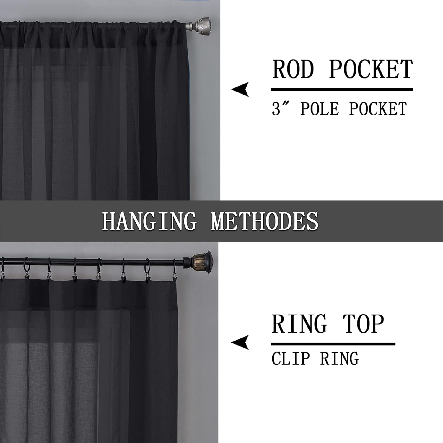 - Light Filtering: The linen look black sheer curtains can allow the right amount of natural light through to bring your room a hazy and softer vision, keep you away from someone’s glance from outside and provide you some privacy.