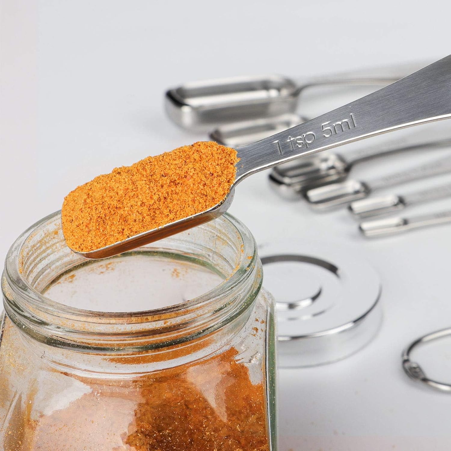 FANGSUN Stainless Steel Narrow Measuring Spoons, Heavy Duty Metal Measuring Spoons with Long Handle and Engraved Measurements Set of 10, For Dry or Liquid, Fits in Spice Jar