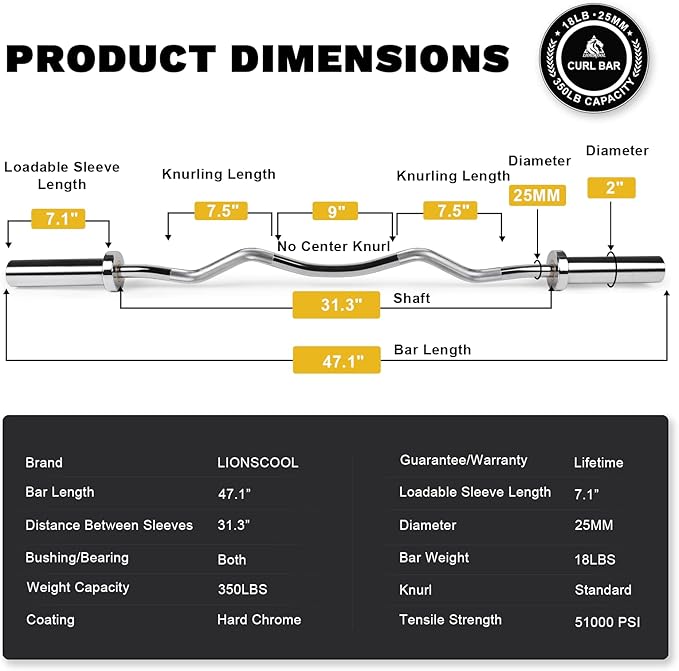 - Unrivaled Durability: Crafted from premium-grade alloy steel, the LIONSCOOL Curl Bar is built to withstand the test of time. The hard chrome finish on the shaft and sleeves ensures outstanding corrosion and oxidation resistance. Say goodbye to the inconvenience of noisy grooved sleeves during plate loading, as our smooth sleeves provide a quiet and effortless loading experience.