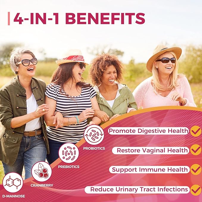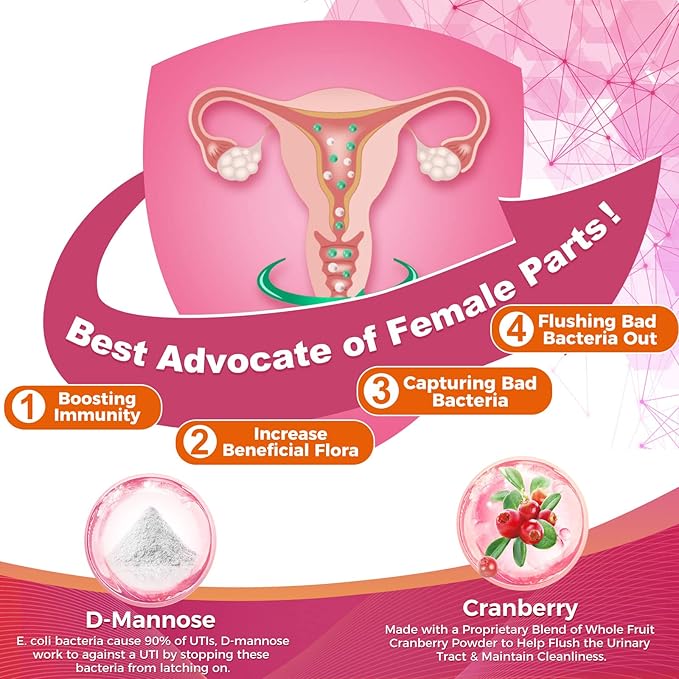 - Cranberry & D-Mannose for Women's Health: Cranberry & D-Mannose are added in this formula with powerful antioxidants to help protect your body from free radicals, prevent the adhesion of certain harmful microbes onto the walls of the bladder and help with UTI relief. They help support vaginal health, immune health, and urinary tract detox and protection without the sugar and calories.