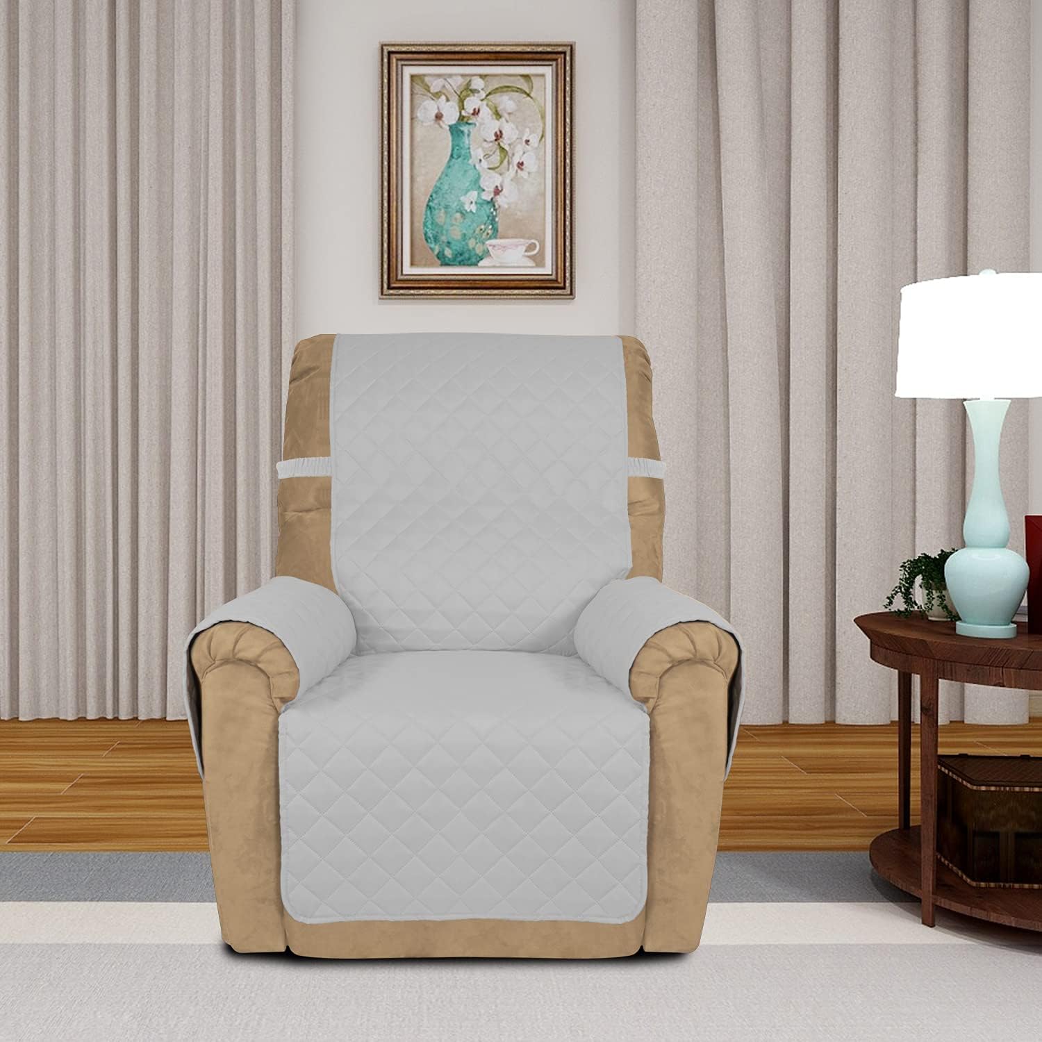 PureFit Reversible Quilted Sofa Cover, Water Resistant Slipcover Furniture Protector, Washable Couch Cover with Non Slip and Elastic Straps for Kids, Dogs, Pets (Small Recliner, Light Gray/Ivory)