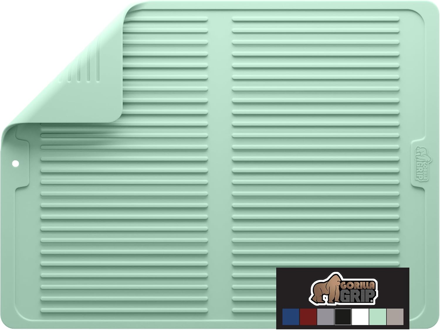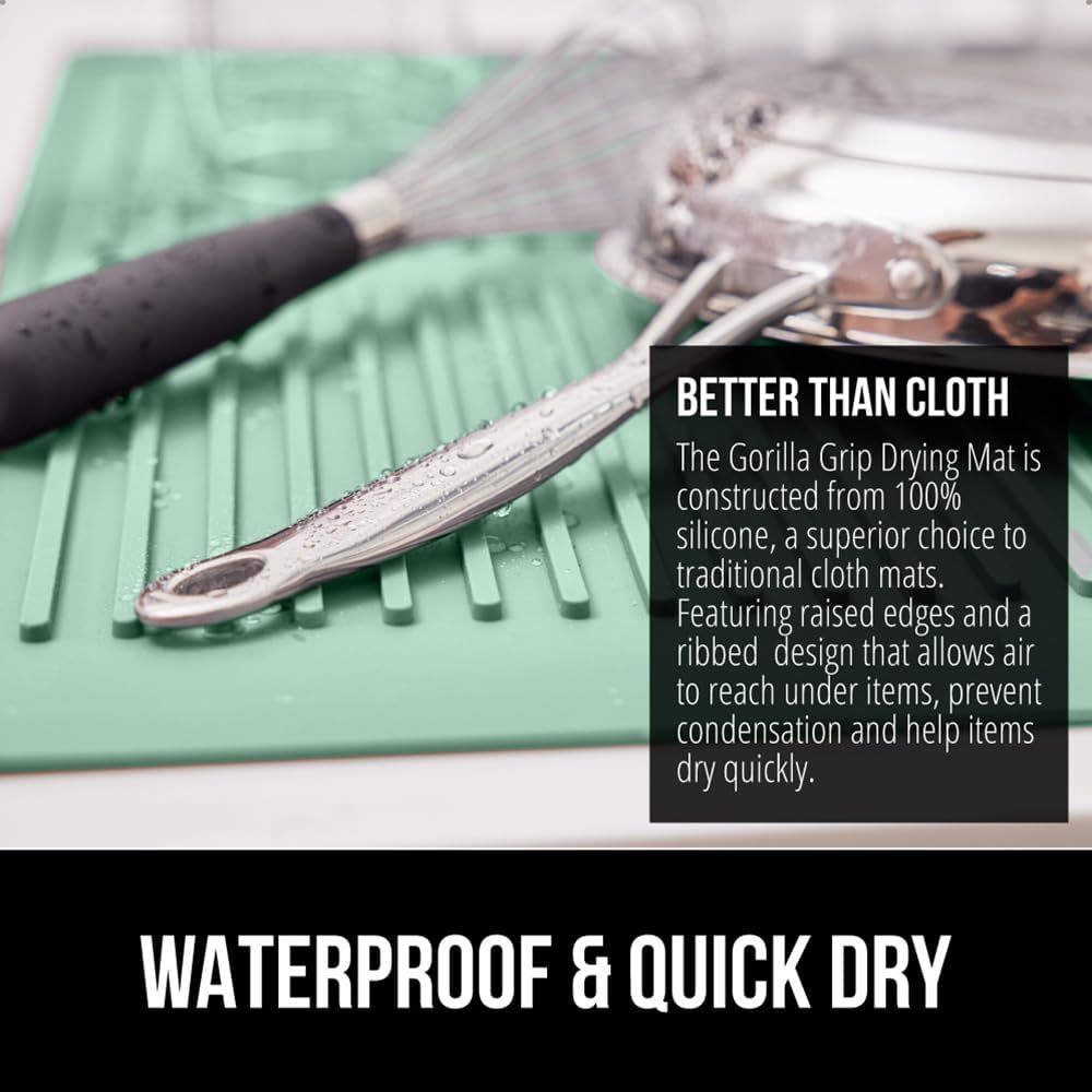 GORILLA GRIP 100% BPA-Free Patented Silicone Dish Drying Mat for Kitchen Counter, Water Catching Ribbed Design, Easy Clean Waterproof Sink Liner, Heat Resistant, Fits Under Rack, 13x11 Inch, Mint