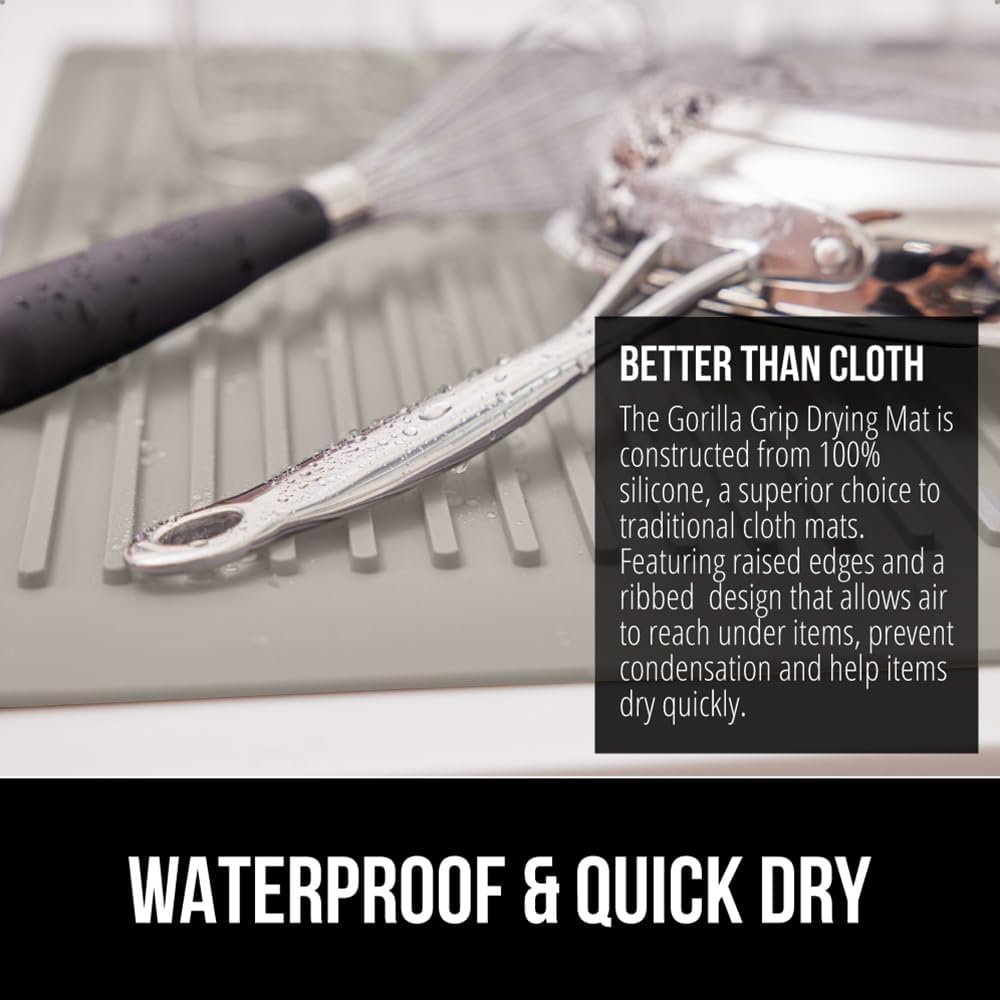 GORILLA GRIP 100% BPA-Free Patented Silicone Dish Drying Mat for Kitchen Counter, Water Catching Ribbed Design, Easy Clean Waterproof Sink Liner, Heat Resistant, Fits Under Rack, 16x12 Inch, Almond