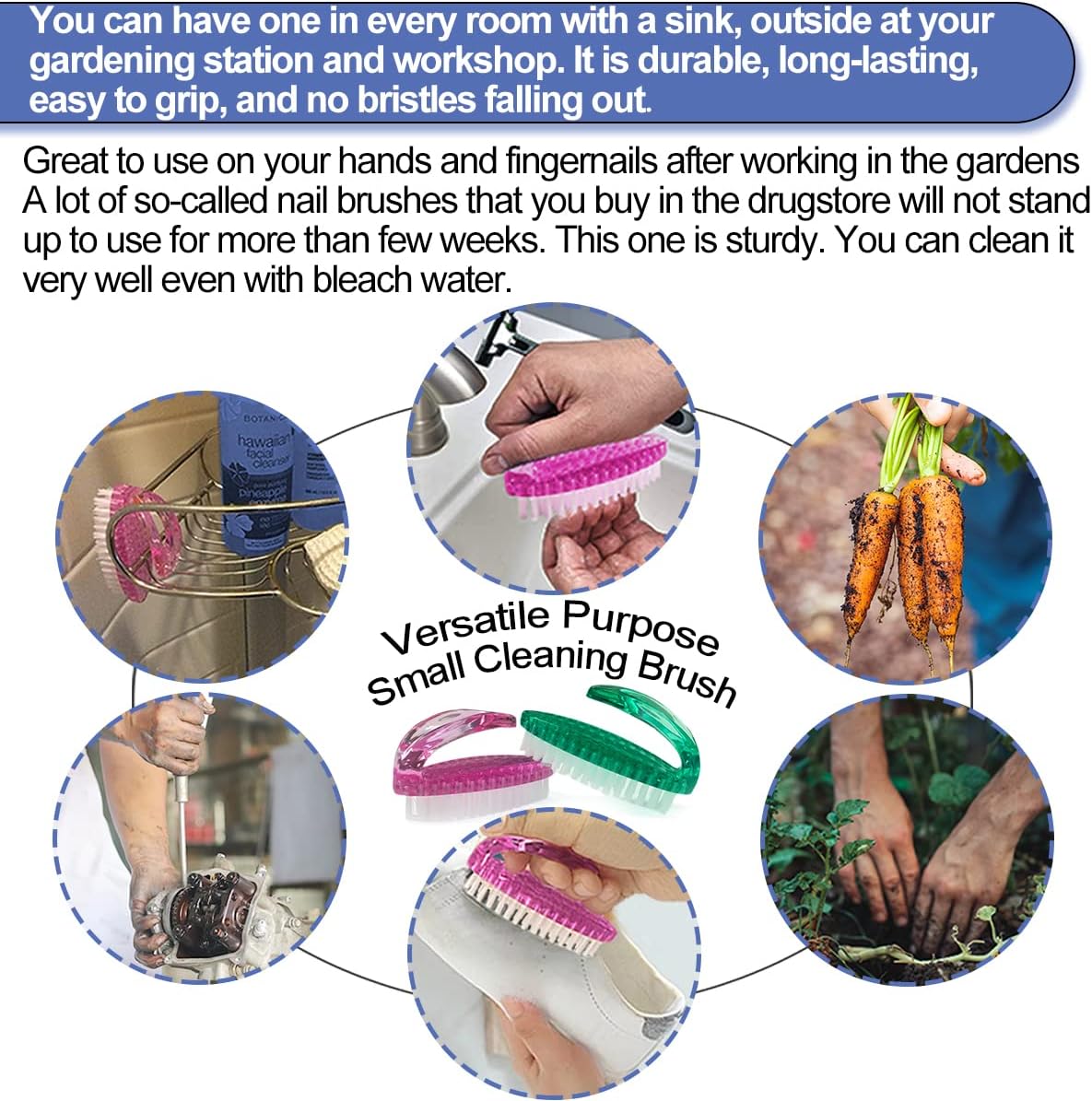 - CUTE & STURDY - The nail cleaning brushes feature an open handle design that is both charming and functional. They are easy to grip or hang, ensuring they stay securely in hand without slipping. Built with sturdy, stiff bristles, these fingernail brushes offer superior durability compared to the softer ones often found in stores meant for manicures. They are particularly suited for gardeners and mechanics, effectively cleaning under nails after gardening or working in the garage.