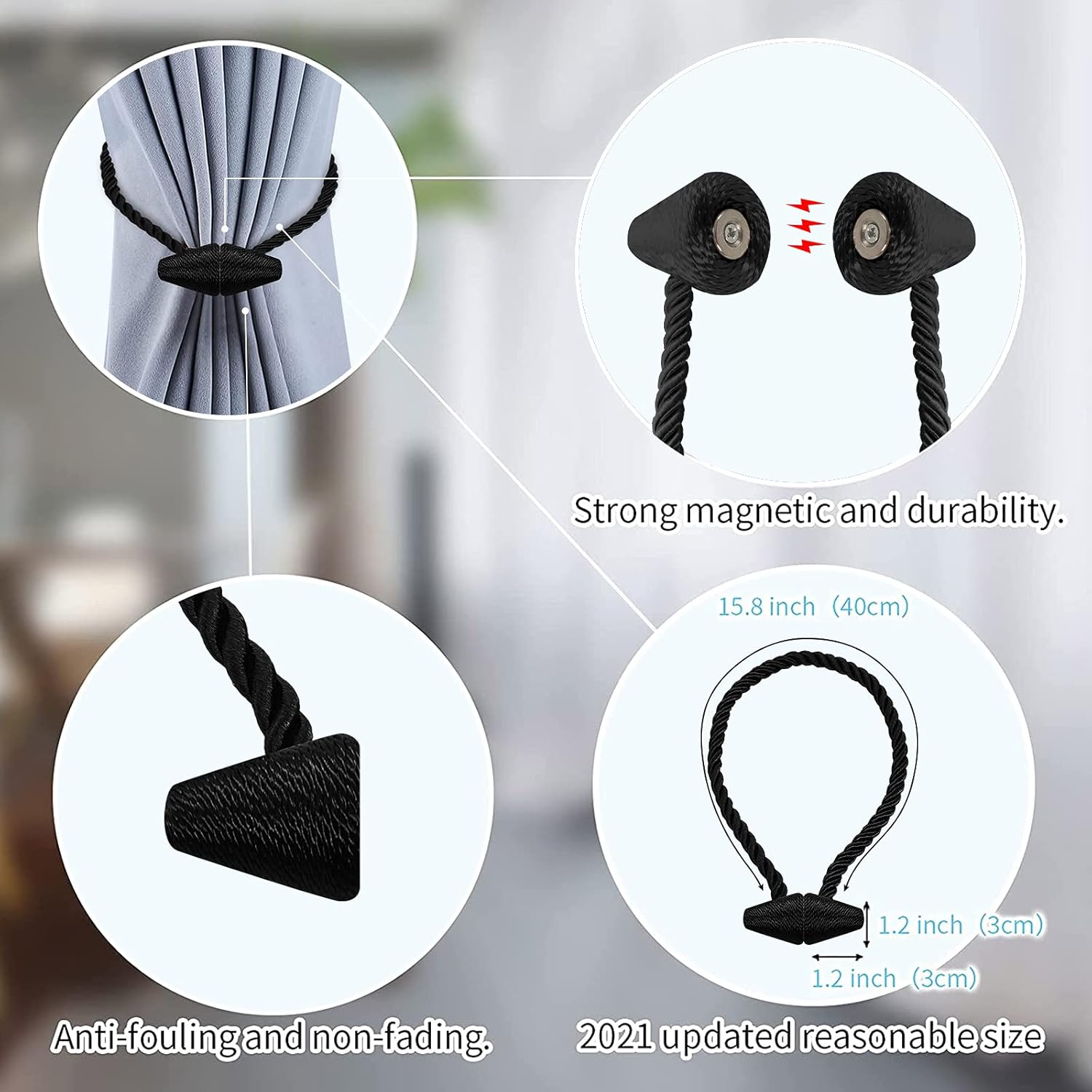 - [Upgrade Powerful Magnetic] Our magnetic curtain tiebacks magnets use high-end new imported nickel-plated magnets, with strong corrosion resistance and durability, more magnetic than ordinary magnetic curtain tiebacks, and do not rust and not lose color. The rope of curtain tie adopts upgrade thickened solid polyester yarn, which is not only durable, but also not easy to wear or pilling.