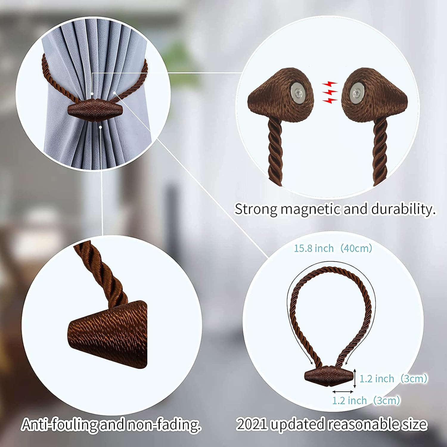 - [Upgrade Powerful Magnetic] Our magnetic curtain tiebacks magnets use high-end new imported nickel-plated magnets, with strong corrosion resistance and durability, more magnetic than ordinary magnetic curtain tiebacks, and do not rust and not lose color. The rope of curtain tie adopts upgrade thickened solid polyester yarn, which is not only durable, but also not easy to wear or pilling.