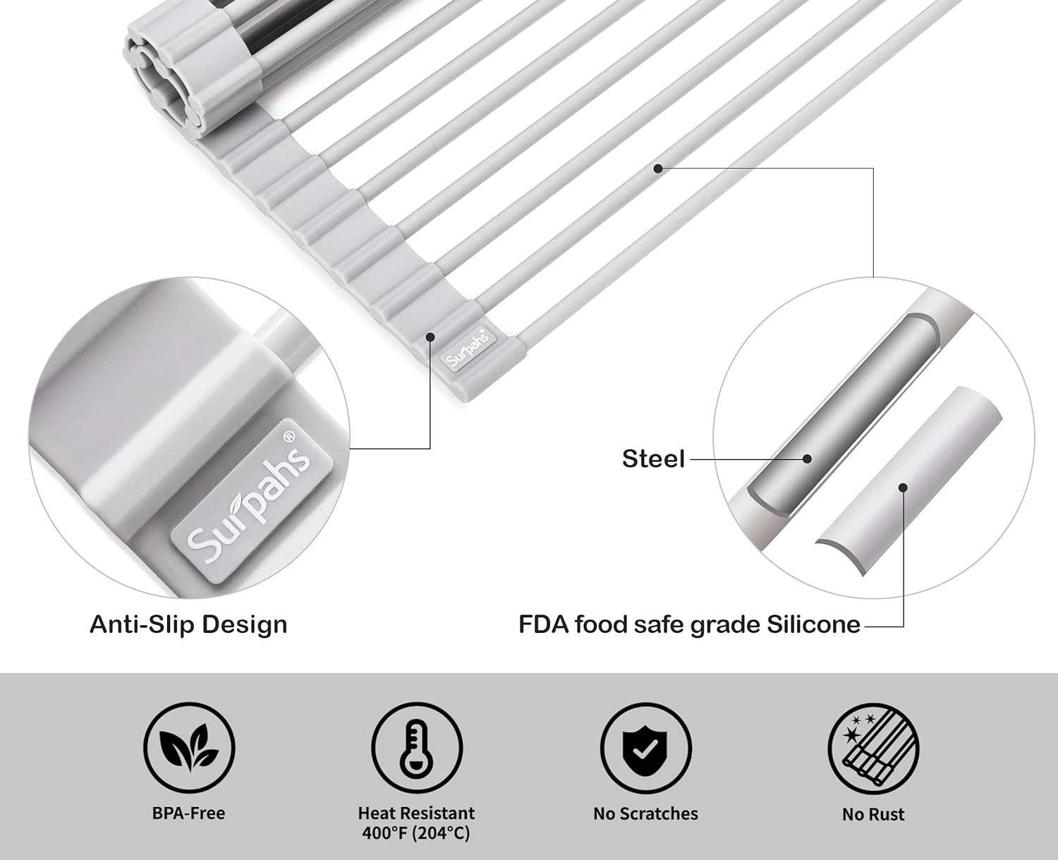 Surpahs Over Sink Foldable Multipurpose Roll-Up Dish Drying Rack, Silicone Wrapped Stainless Steel, Warm Gray, 20.5" x 15.5"