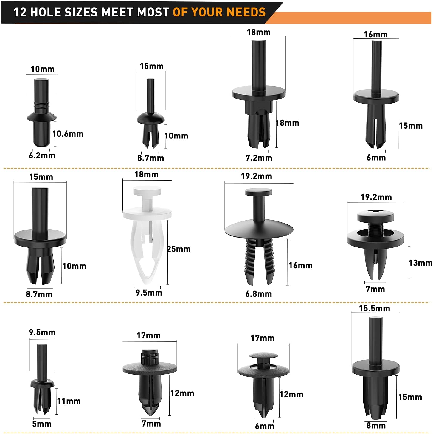 - UNIVERSAL FIT KIT- The kit contains 12 types of most common sizes of fastener clips, suitable for the OEM replacement in 5-10mm hole sizes,that you’ll always have the right size