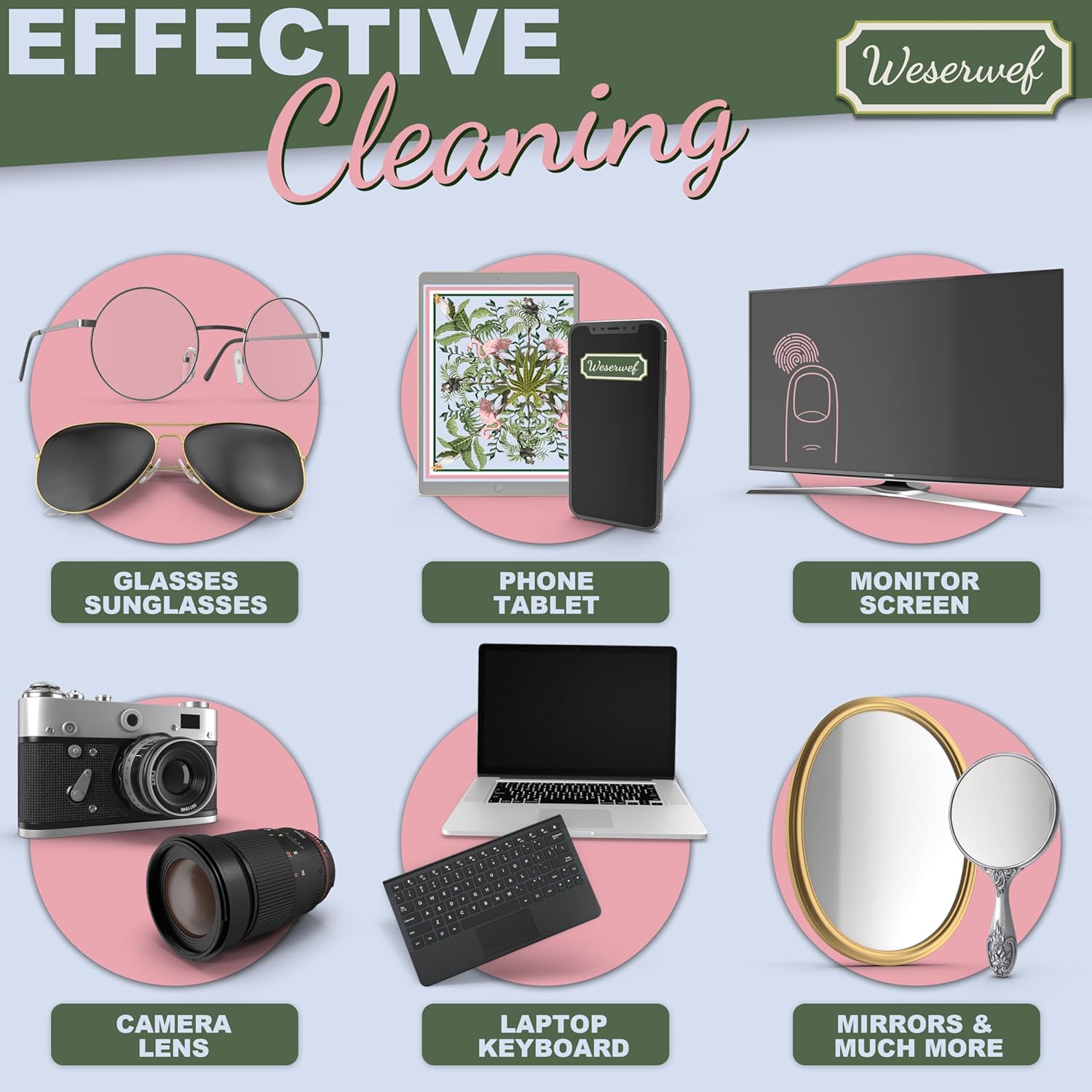 - VERSATILE SCREEN & LENS CLEANER FOR ALL DEVICES: Designed for universal use, this multi-purpose cleaning cloth is ideal for eyeglasses, lenses, smartphones, tablets, laptops, TVs, VR headsets, gaming monitors, binoculars, and more. Whether you need a professional camera lens cleaner, a streak-free phone screen wipe, or a gentle microfiber cloth for delicate optics, Weserwef delivers superior performance across all surfaces.