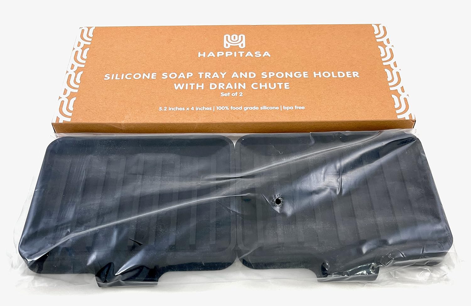 Happitasa Silicone Soap Dish Tray and Sponge Holder with Drain Chute, Pack of 2 | Bathroom and Kitchen Sink Organizer Caddy (Black, 5.2"x4", 7.2 Ounces)