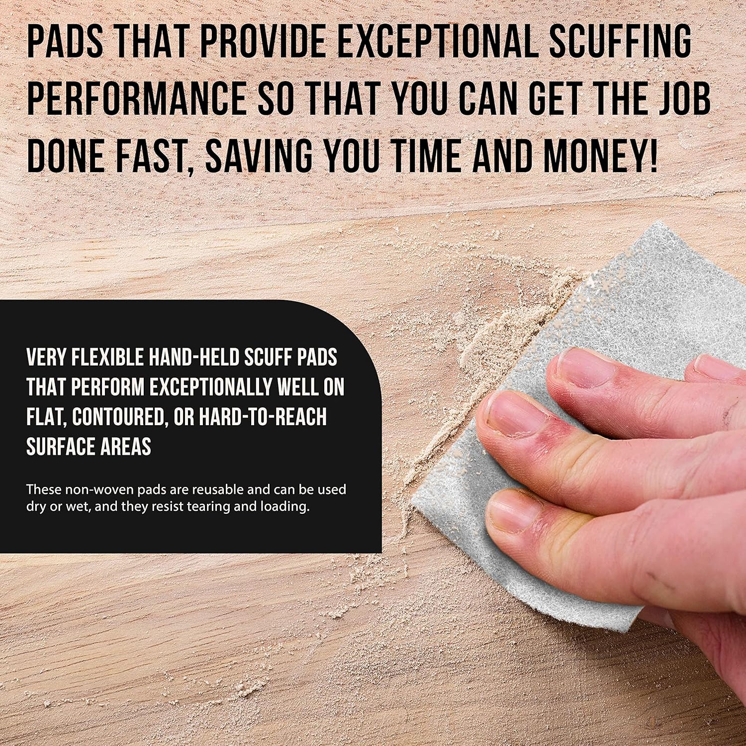- Very flexible hand-held scuff pads that perform exceptionally well on flat, contoured, or hard-reach surface areas. Three-dimensional non-woven abrasive pads made with cut fiber strands, coated with resin, and durable fine aluminum oxide abrasive. These non-woven pads are reusable and can be used dry or wet, and they resist tearing, loading, and clogging. They deliver a consistent scratch pattern and uniform finish, providing you with increased productivity.