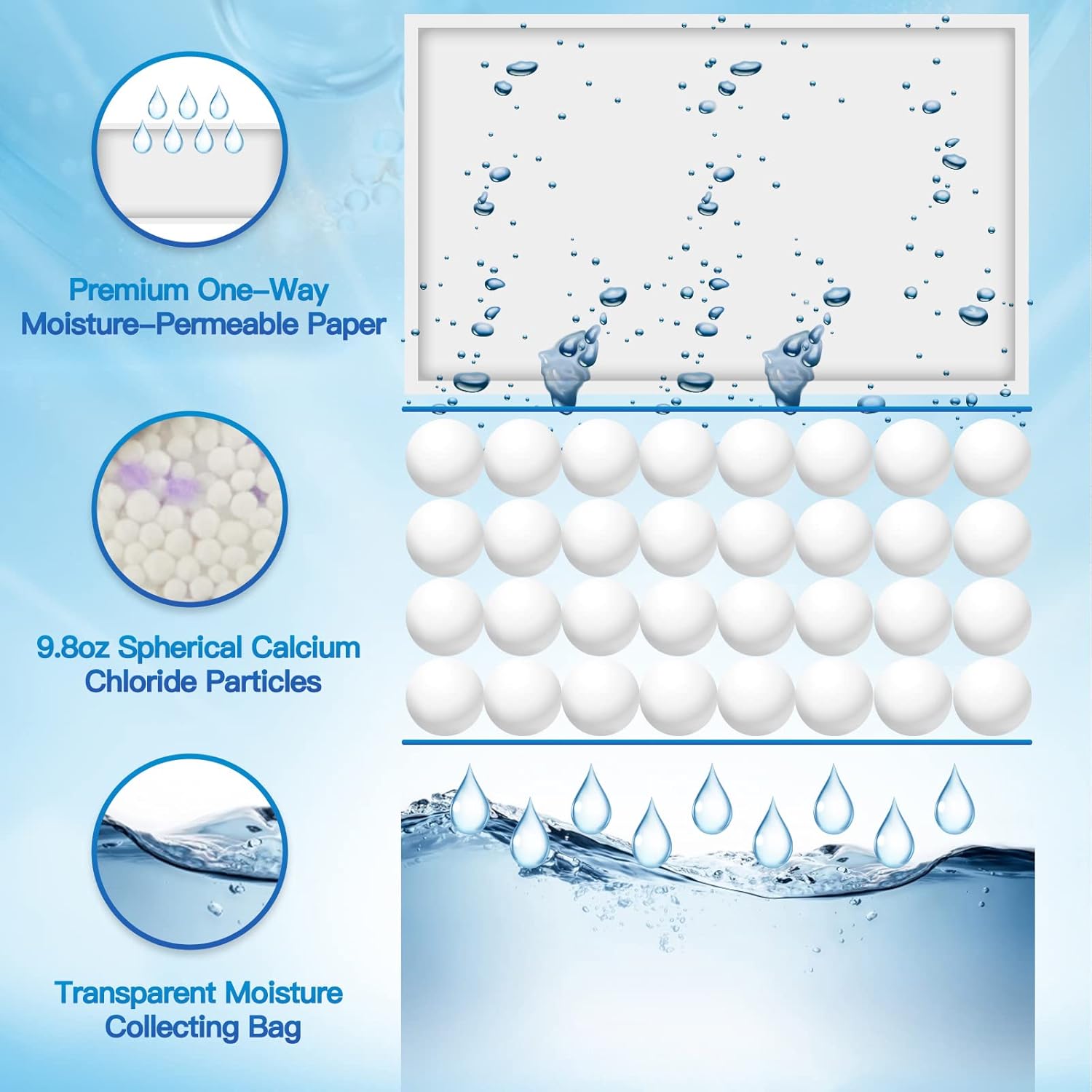 - HOW THEY WORK: Calcium chloride particles combine with moisture in the air and once they become completely solidified the particles will dissolve and the solution will flow into water reservoir. Please be patient for the process, it may take some time.