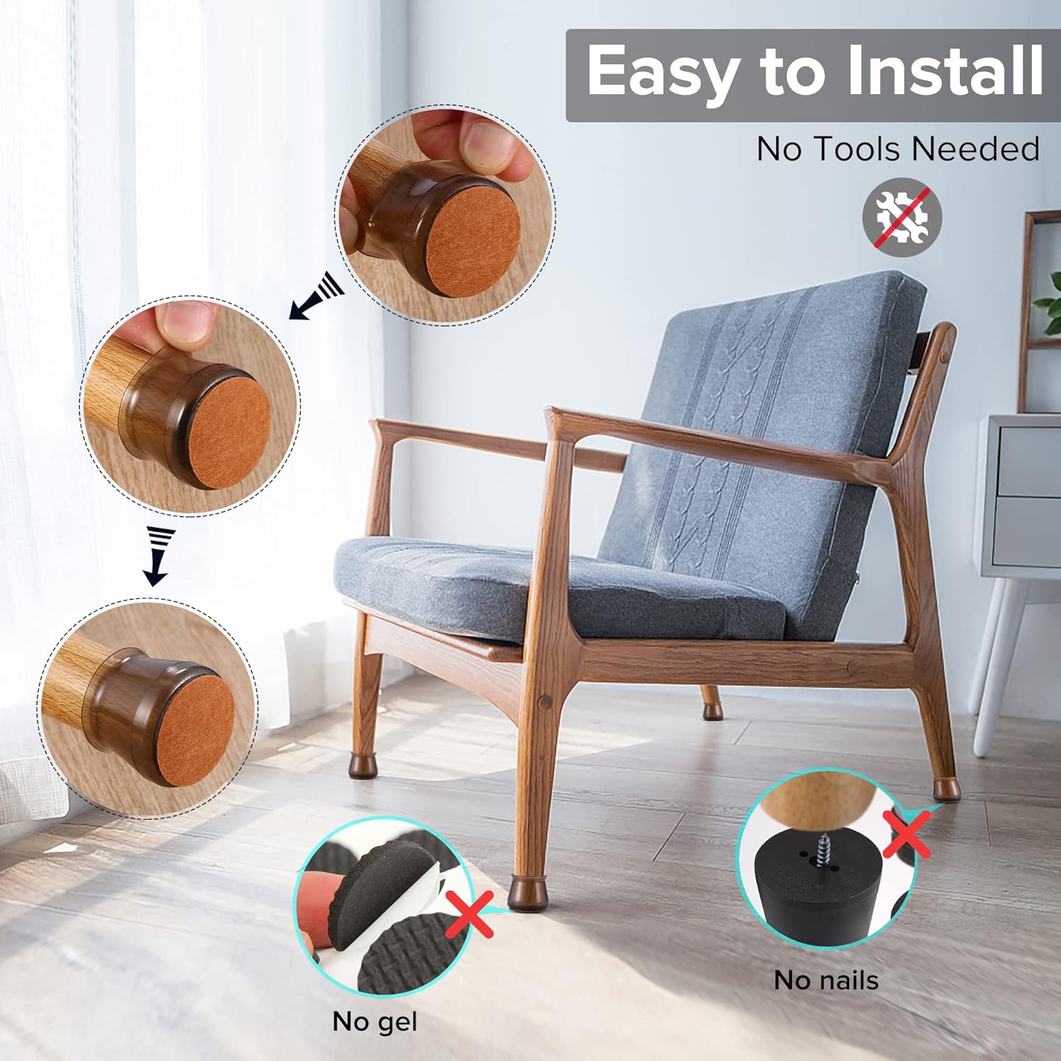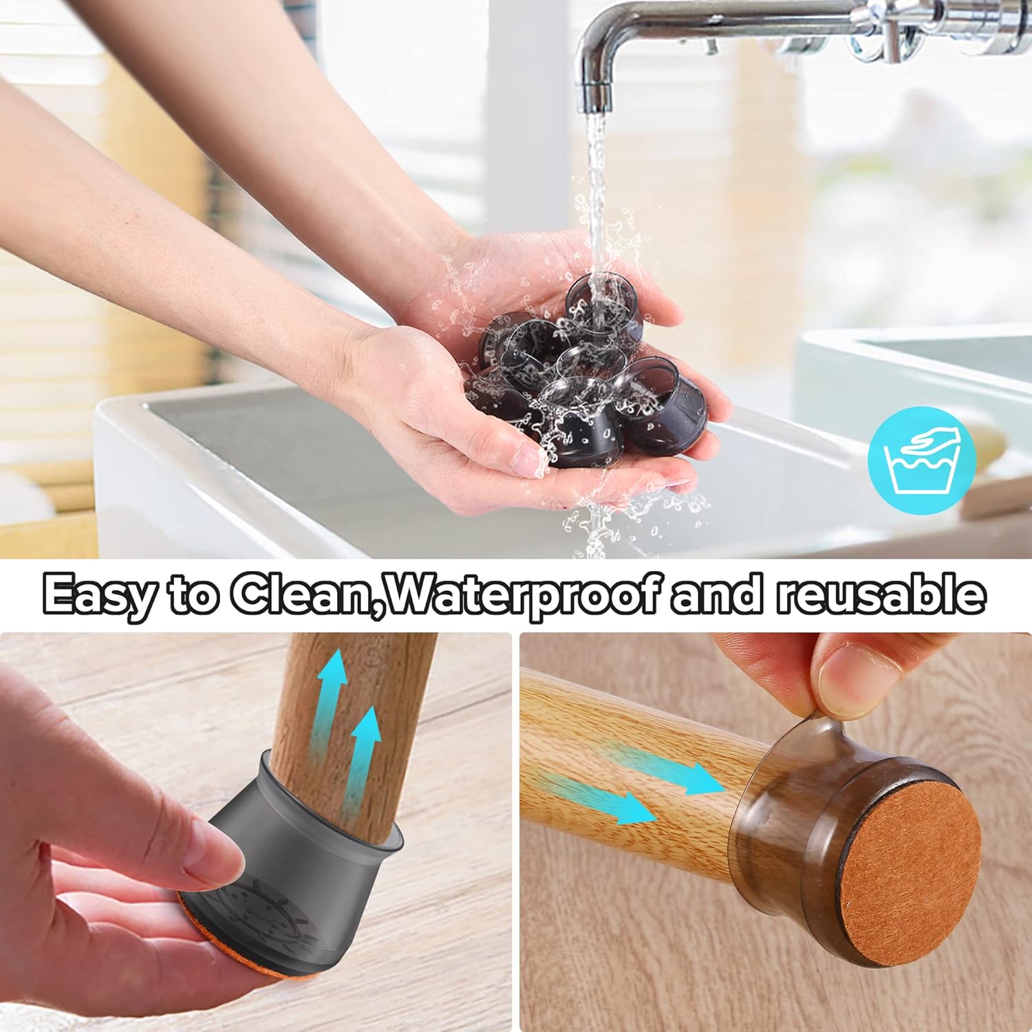 - ✅【Easy to Use】The chair leg covers to protect floors has high transparency, which greatly restore the original color of the table and chair legs, look more natural. The furniture leg cap is easy to install, without the use of tools. When the furniture chair socks are dirty, the chair stoppers can be cleaned and used repeatedly. Mainly suitable for smooth floors such as hardwood, tile, composite floor, and vinyl floor. Clear cap style match with most floors.