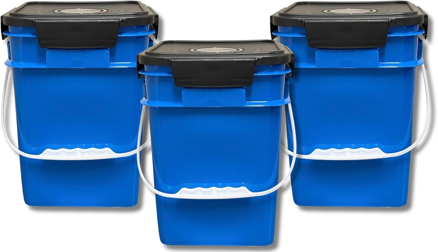 House Naturals 4 Gallon Square Food Grade Bucket Pail with Plastic Handles and Lid (Pack of 3) Made in USA containers (Blue)