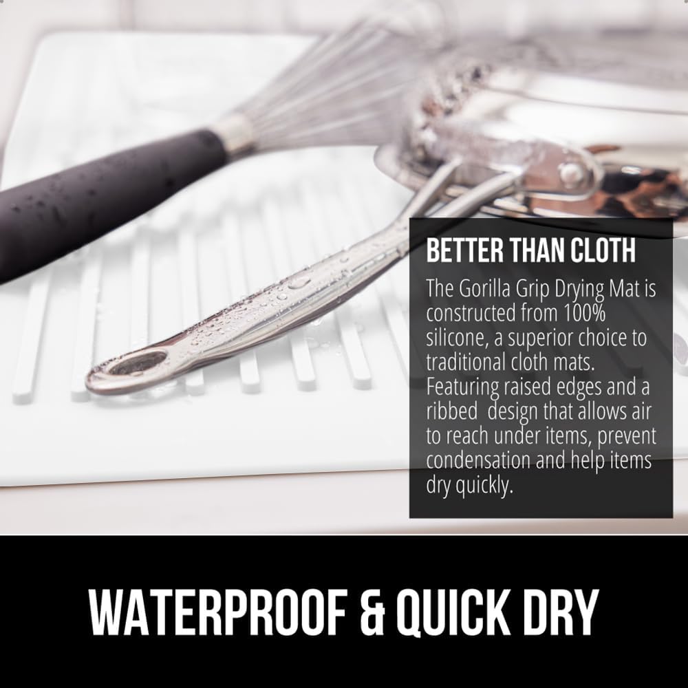 GORILLA GRIP 100% BPA-Free Patented Silicone Dish Drying Mat for Kitchen Counter, Water Catching Ribbed Design, Easy Clean Waterproof Sink Liner, Heat Resistant, Fits Under Rack, 13x11 Inch, White