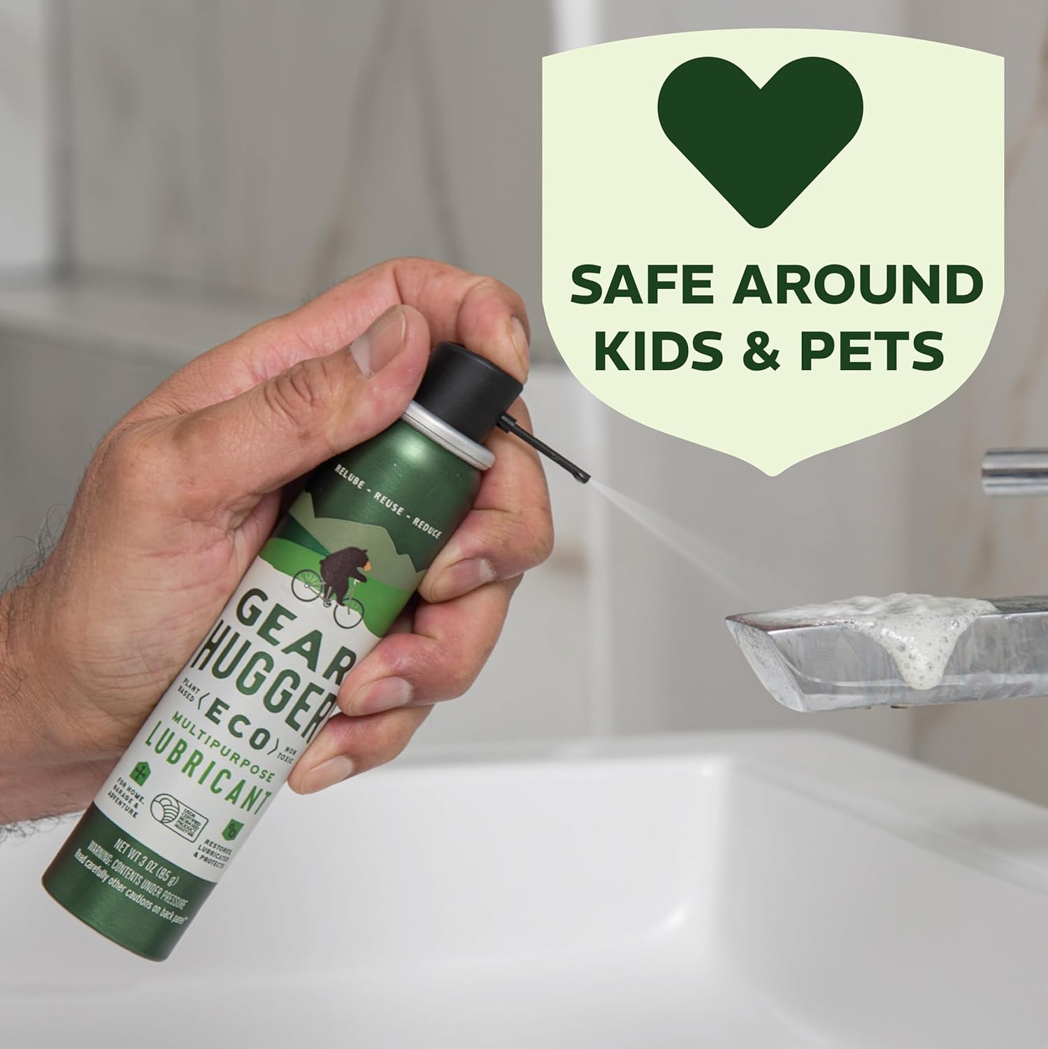 - SAFE AROUND KIDS & PETS, NON-TOXIC, AND EASY TO USE - Contrary to petroleum-based lubricants, Gear Hugger offers a safer alternative that can be used around kids & pets. Gear Hugger is a non-toxic, odorless and biodegradable solution that is easy to use. Forget about the spills left by silicon greases. Gear Hugger is designed with a two way straw nozzle to provide more control. A targeted stream allows an easy and precise application, ensuring uniform and consistent coverage every time!