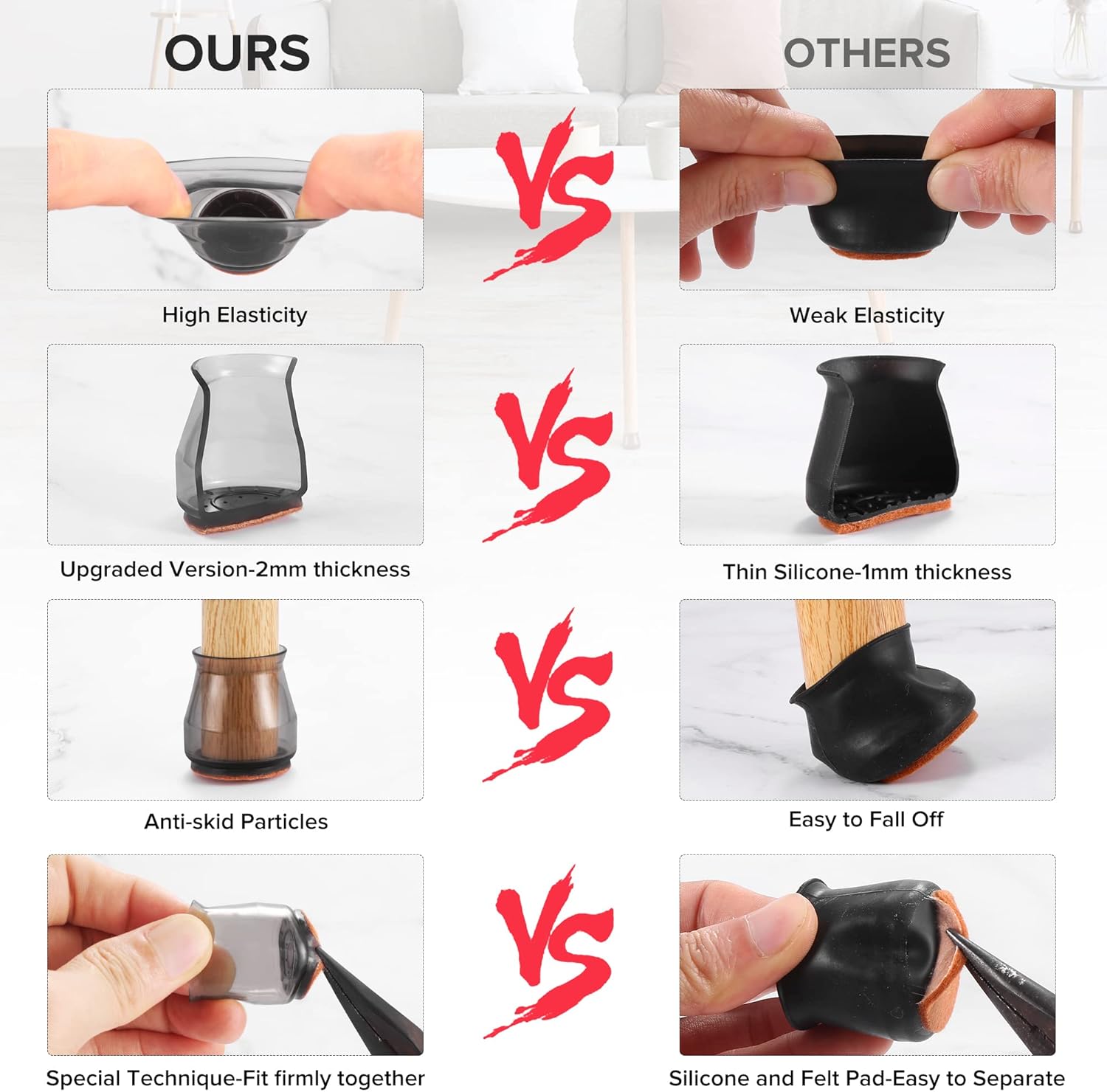 - ✅【Latest Upgrade】Compared with most of the traditional 1mm furniture pads on the market, our chair leg floor protectors are made of 2mm thick silicone, which will never be damaged, durable. The chair leg protectors will not change color when stretched. Inside of the inner sleeves are particles with anti-slip, which will firmly fix the chair and never make the covers fall off. Felt pads at the bottom make your furniture move silently and smoothly along floors without leaving marks and noise.