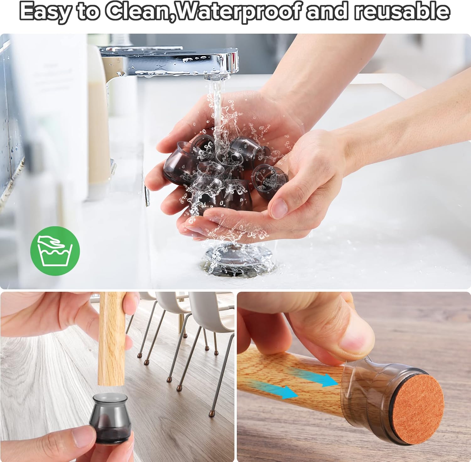 - ✅【Easy to Use】The chair leg covers to protect floors has high transparency, which greatly restore the original color of the table and chair legs, look more natural. The furniture leg cap is easy to install, without the use of tools. When the furniture chair socks are dirty, the chair stoppers can be cleaned and used repeatedly. Mainly suitable for smooth floors such as hardwood, tile, composite floor, and vinyl floor. Clear cap style match with most floors.