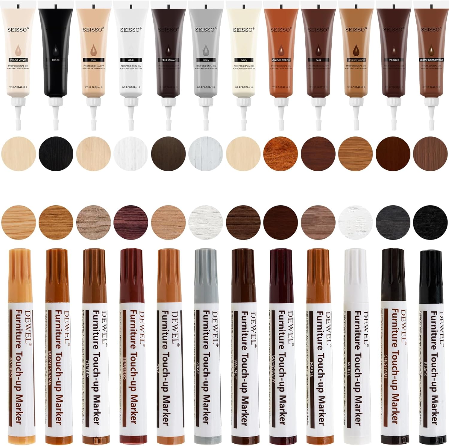 SEISSO Wood Furniture Repair Kit, Wood Filler and Touch Up Markers, Set of 28 Laminate Vinyl Floor Repair Kit for Scratches, Cracks, Holes, Discoloration for Door, Floor, Table, Cabinet
