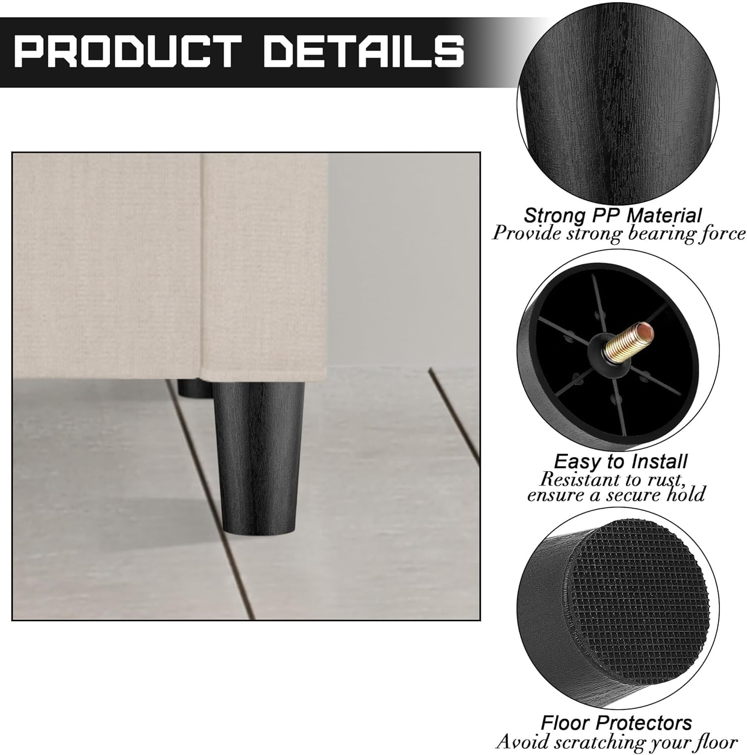 - Advantages: these replacement furniture legs with strong bearing force can help lift your furniture immediately, make you efficiently clean the place under furniture, and provide storage space for your furniture; all accessories are complete, so you can upgrade your furniture within seconds; each sofa leg is equipped with elastic rubber covers, providing additional protection and anti-slip function