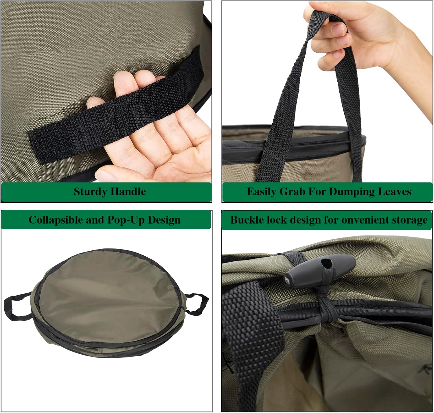 - 【Collapsible and Pop-Up Design】 Collapsible lawn and leaf waste bag collapses quickly and easily for compact storage when not in use and expands quickly and easily when needed. Pop-Up Trash Can has 2 carrying handles on top for easy carrying and dumping. 2 strong tough handles that allows you easily grab for dumping leaves. Flexible and hard spiral spring spine, which can be automatically ejected, and it can also be folded for quick and easy storage, Does not take up space.