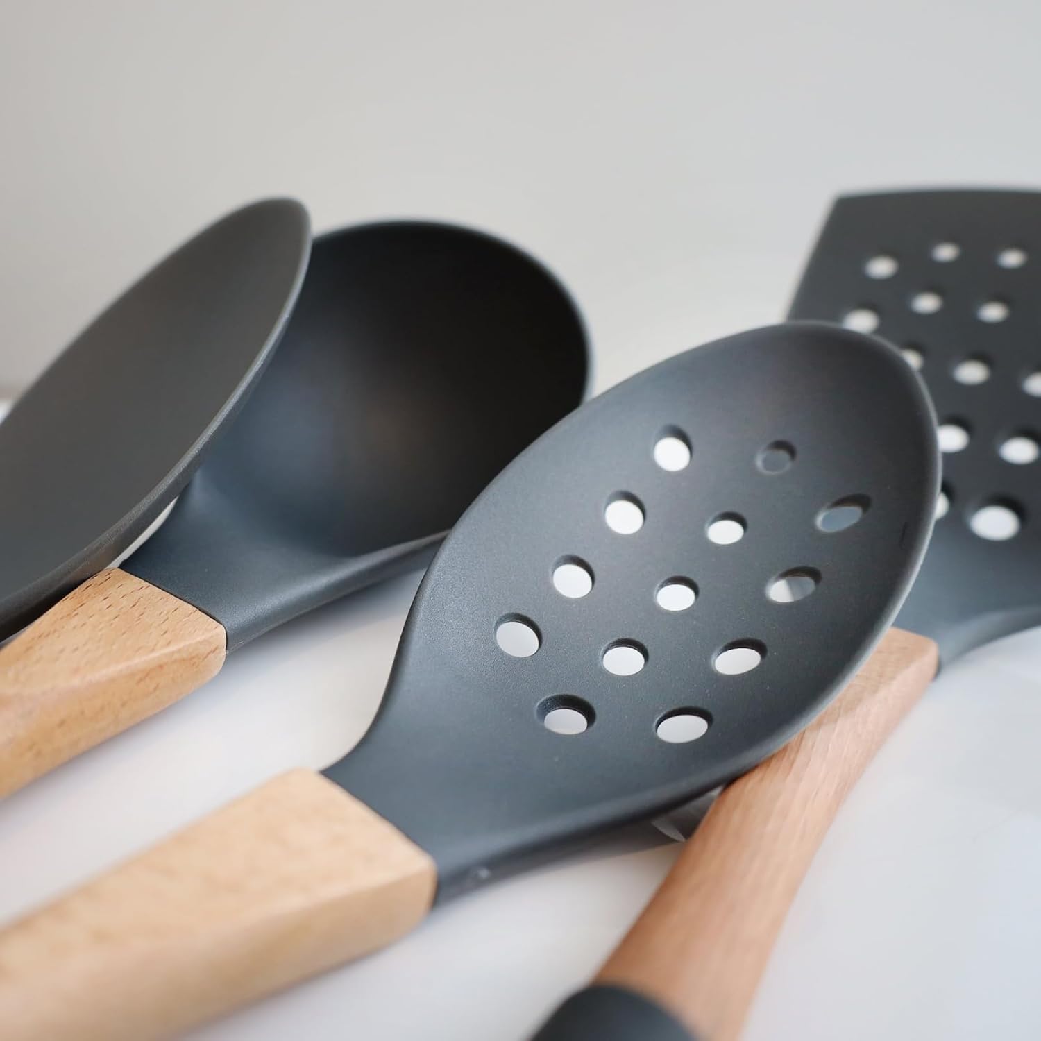 Beille 5pc Dark Grey Nylon Wooden Kitchen Utensils with Cooking Spoons, Soup Ladle, Skimmer Spoon and Spatula, 13 Inch