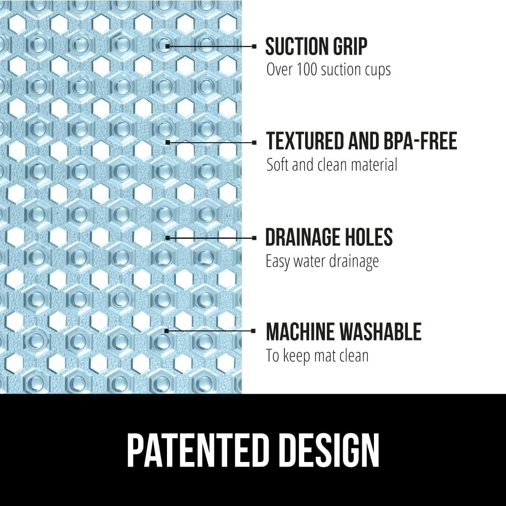 - PATENTED DESIGN WITH POWERFUL SUCTION GRIP: a shower mat designed to securely stay in place; the patented mat features hundreds of suction cups that effectively help secure the mat to your tub or shower floor