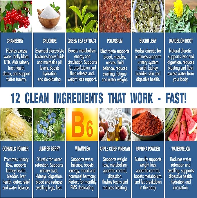- YOUR NATURAL DIURETICS FOR WATER RETENTION: Powerful Water Away Herbal Supplements For Healthy Fluid Balance Formulated With Non-gmo Vitamins, Herbal Extracts, Herbs, Minerals, Green Tea, Cranberry, Apple Cider Vinegar, Paprika, Dandelion Root, Vitamin B6, Chloride, Potassium Supplement, Watermelon. Boost Energy Levels, Comfort And Mobility With Our Diuretic Capsules For Adults. Pair With Enclare Urinary System Complex, 15 Day Detox, Beetroot Flow And Recipes.
