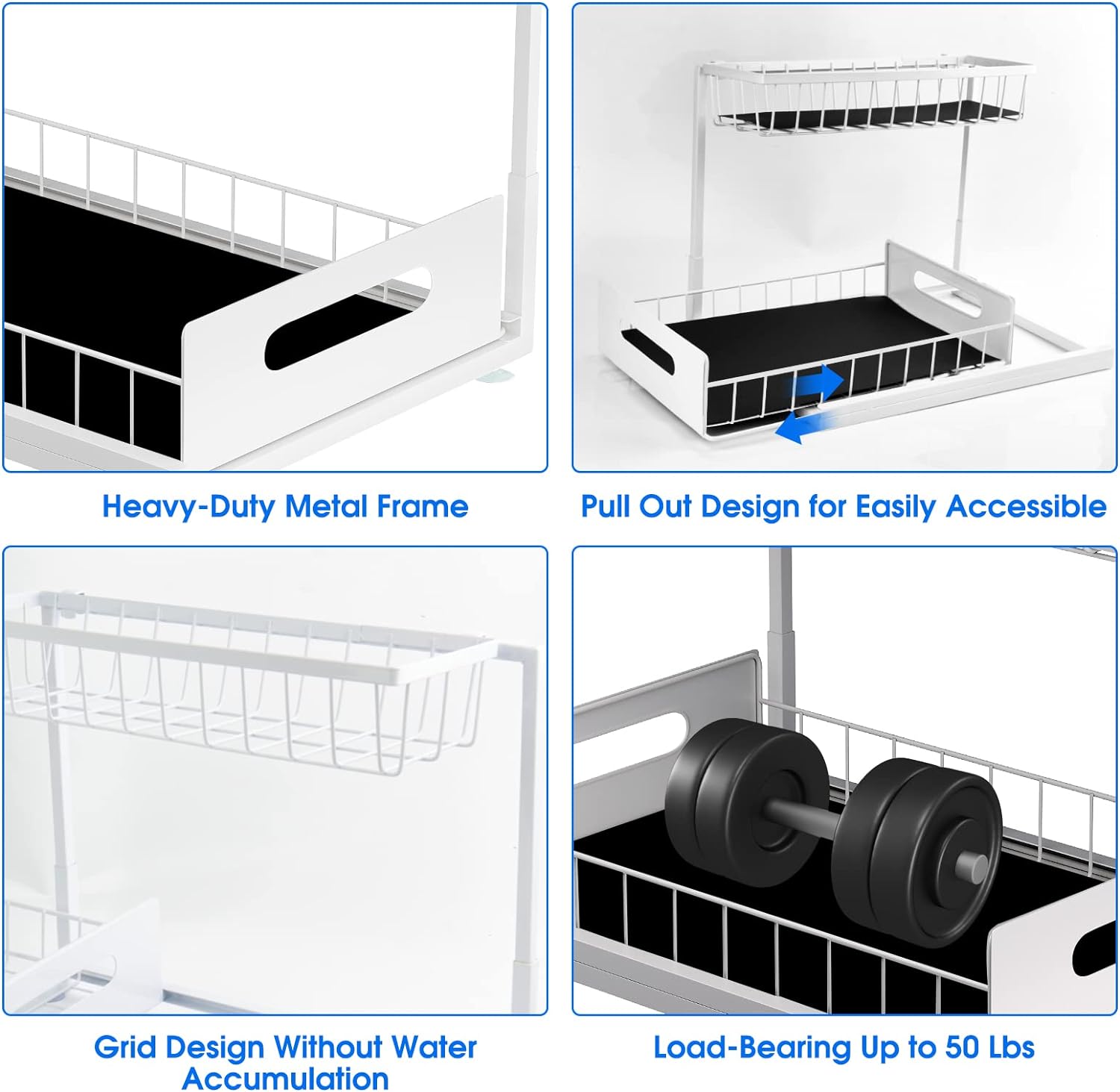 - High-Quality: Our under sink organizer is made of carbon steel, which is durable and resistant. The baking paint process makes the surface more smooth with good anti-rust and can keep the metallic luster even in the wet bathroom or greasy kitchen, the bottom has 4 rubber feet to protect the surface from scratches. The sink rack has a carrying capacity of up to 55lbs and can hold heavier items. It will not deform even if it placing heavy objects for a long time, Pulling is also very smooth.