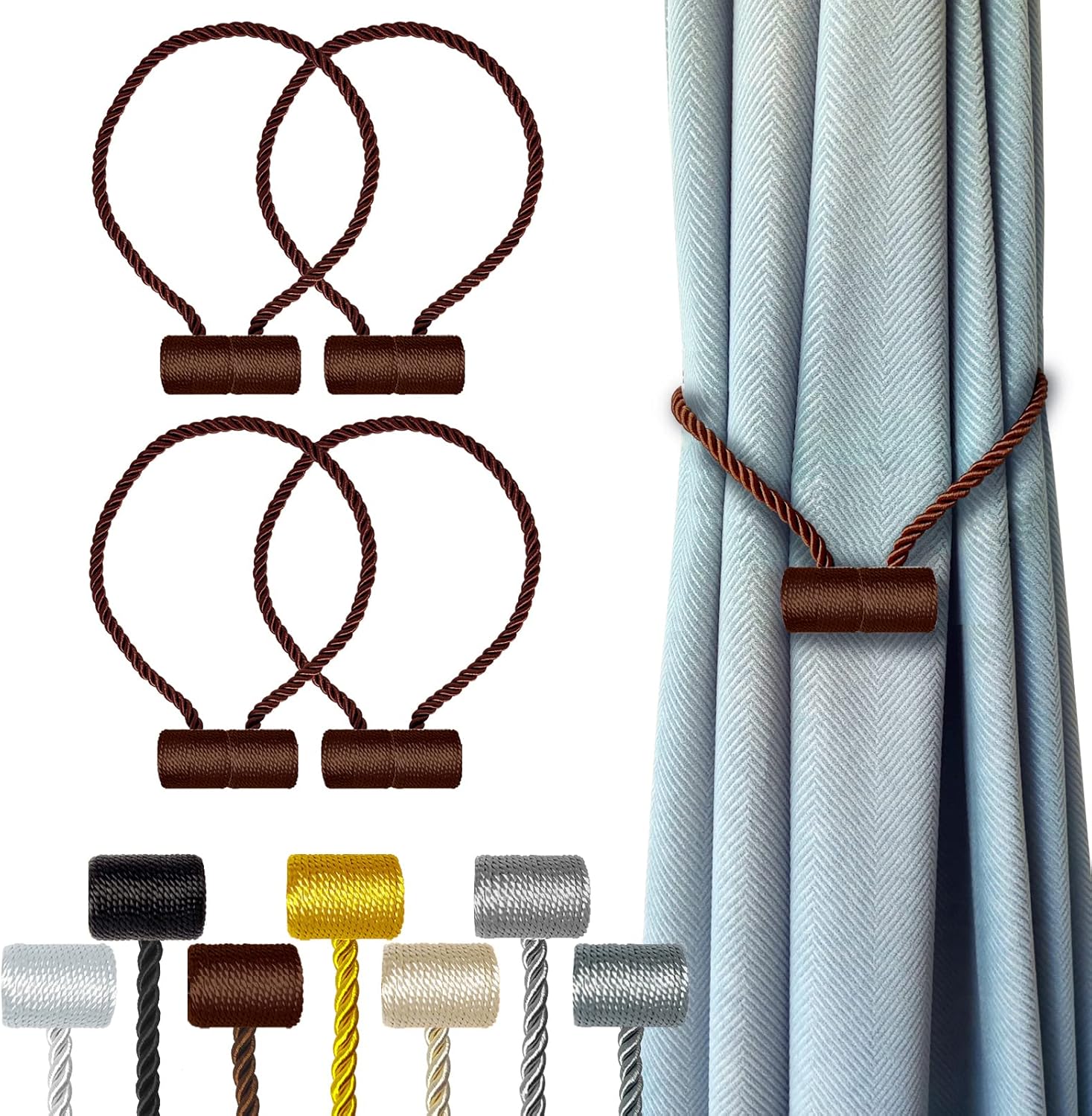 - [Upgrade Powerful Magnetic] Our magnetic curtain tiebacks magnets use high-end new imported nickel-plated magnets, with strong corrosion resistance and durability, more magnetic than ordinary magnetic curtain tiebacks, and do not rust and not lose color. The rope of curtain tie adopts upgrade thickened solid polyester yarn, which is not only durable, but also not easy to wear or pilling.