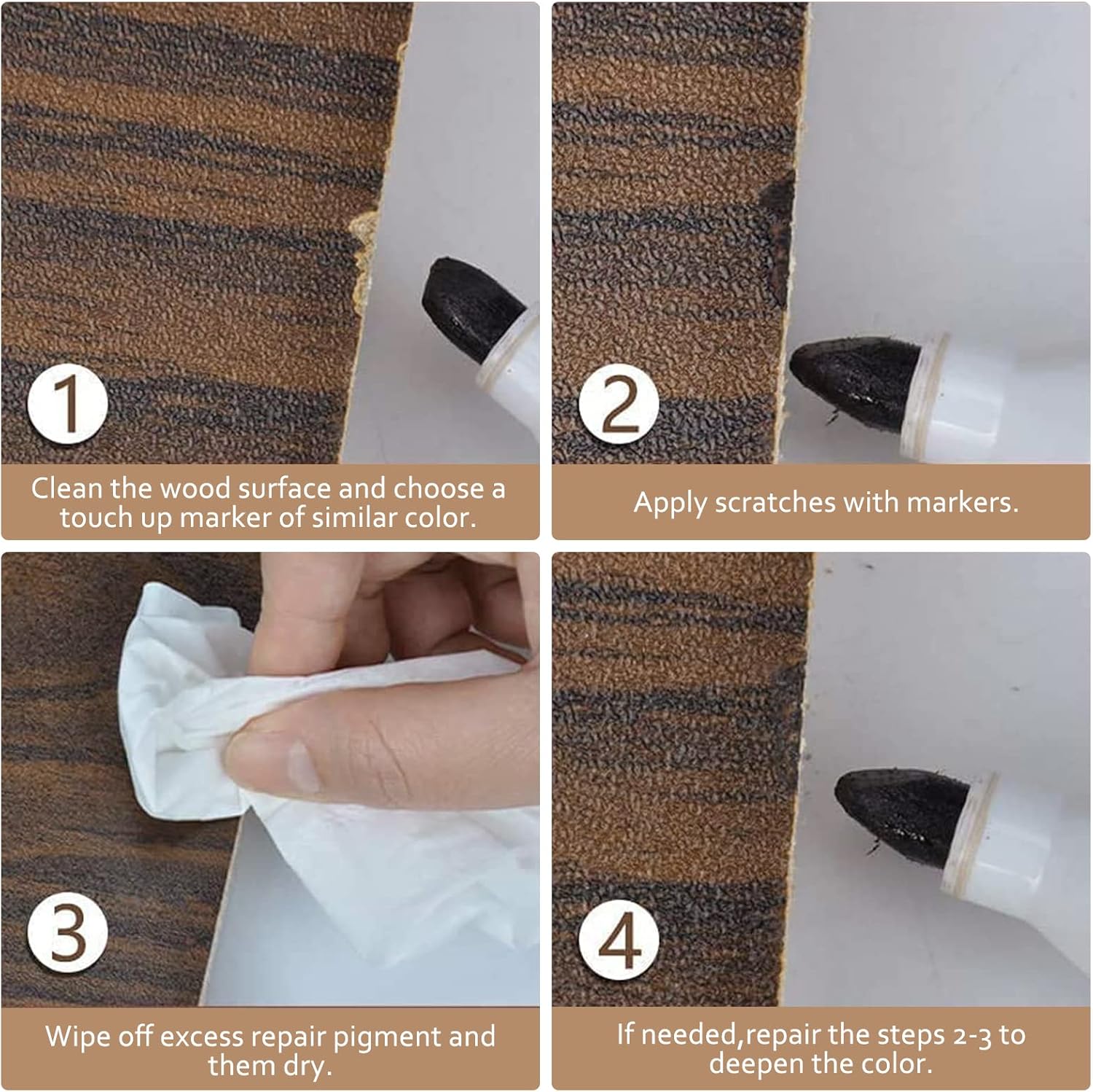 - Set Includes: This furniture touch up kit with 8 Furniture Scratch Repair Markers, 8 wood stain, 2 Application Brushes, 1 color palette, and 1 Smoothing Spatula. Complete wood scratch repair kit comes to help you be a winner in a professional restoration.