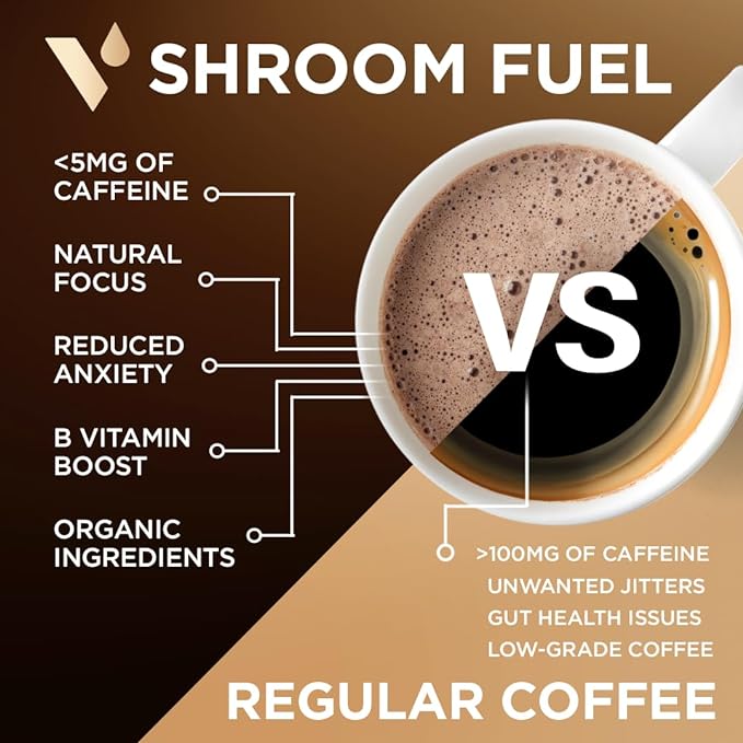 - LESS THAN 5MG OF CAFFEINE: Ever wondered what your days could look like without coffee? Can your body benefit from cutting down on caffeine? We created Shroom Fuel with organic superfoods and vitamins for customers who want to harness natural energy and focus without consuming too much caffeine. Start gaining independence from coffee with just one sip!