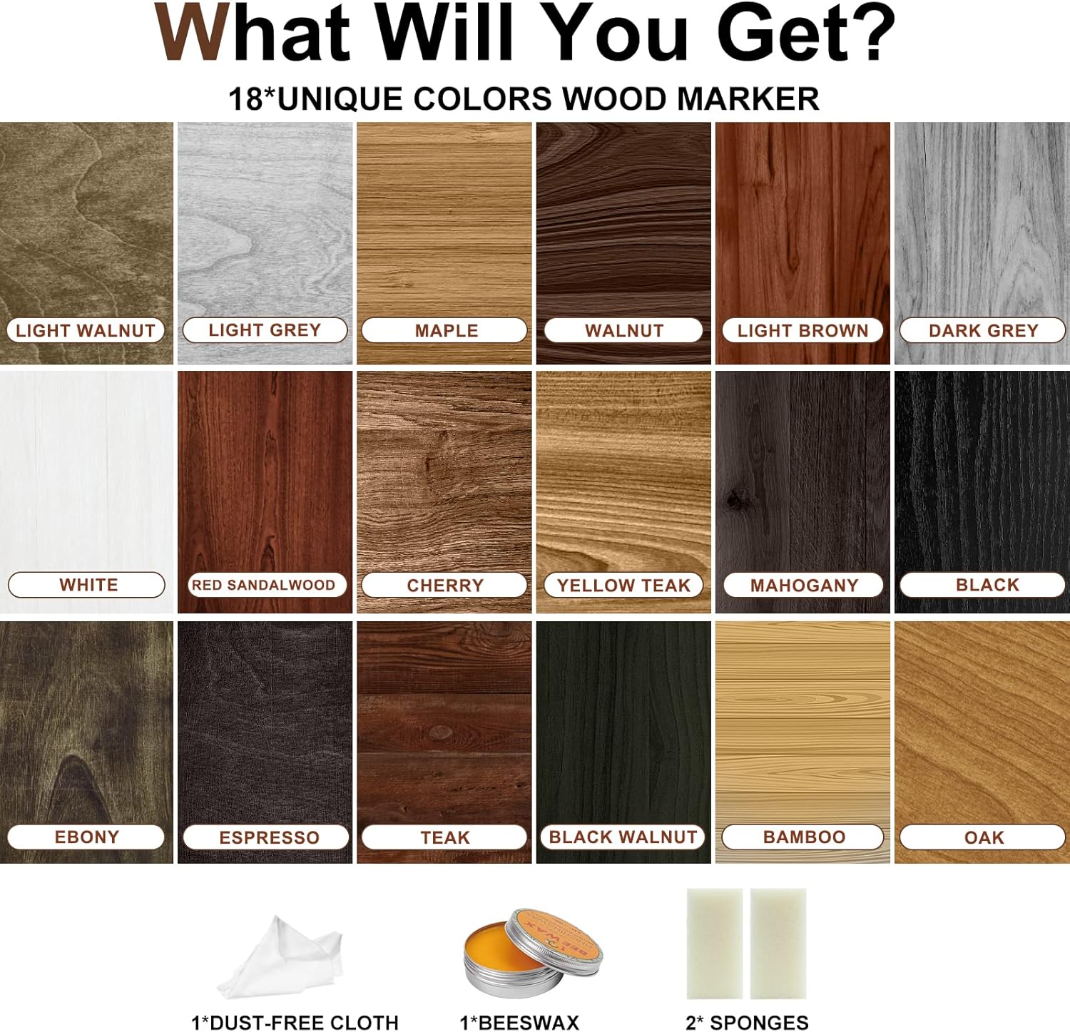 - 18 Unique & Rich Colors: Red sandalwood, walnut, mahogany, cherry, bamboo, light brown, yellow teak, maple, oak, black walnut, light walnut, ebony, teak, espresso, white, black, light gray, dark grey. The 18 wood pens markers are specially developed for all common wood floor and furniture colors to meet all your wood furniture restoration needs